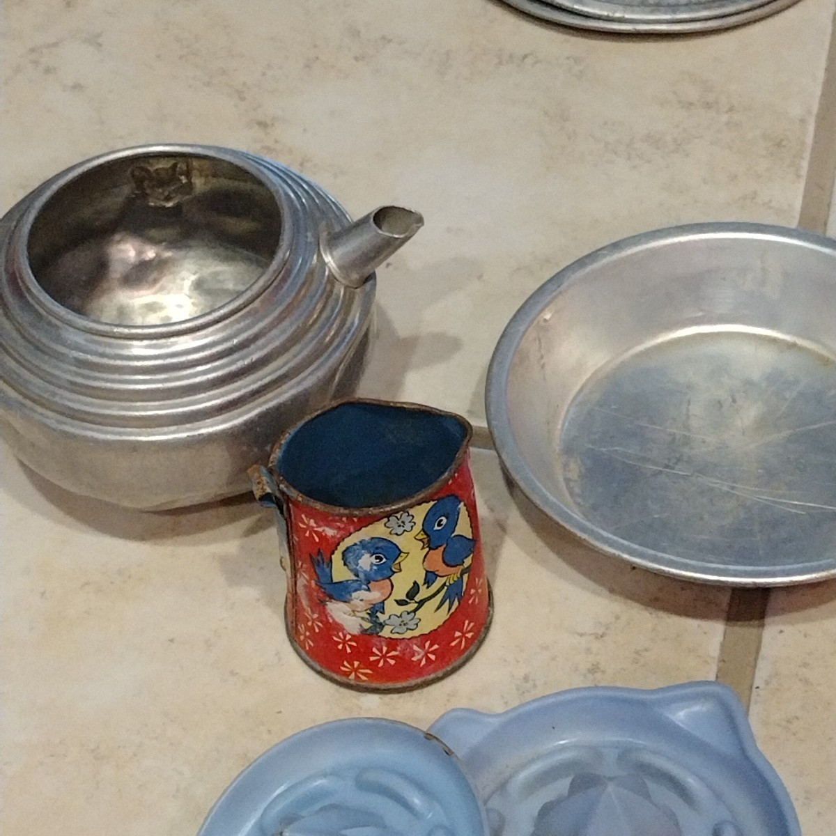 как выглядит Vintage 1940-50s Ohio Art Tin Litho Childs Play Tea Set/Dishes 50 Pieces фото