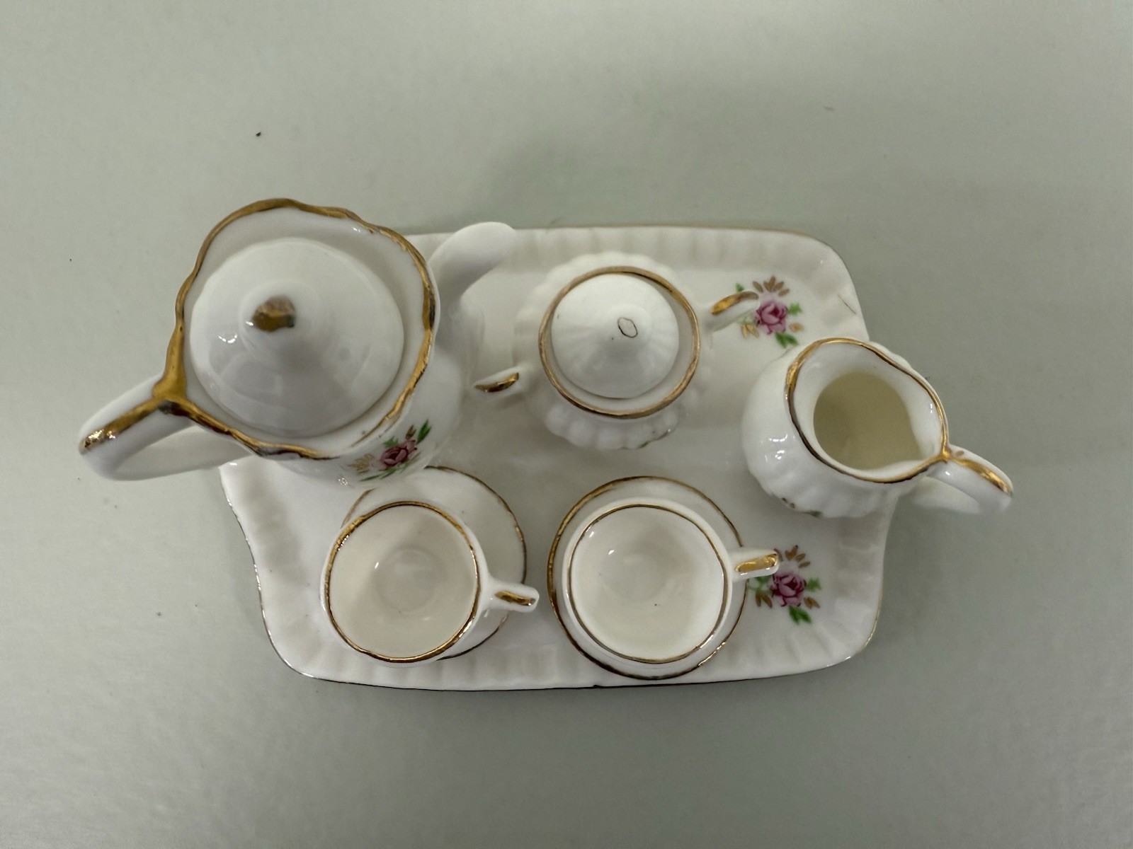 Miniature Ceramic 10 Pc Tea Set Pink Roses Gold Trim