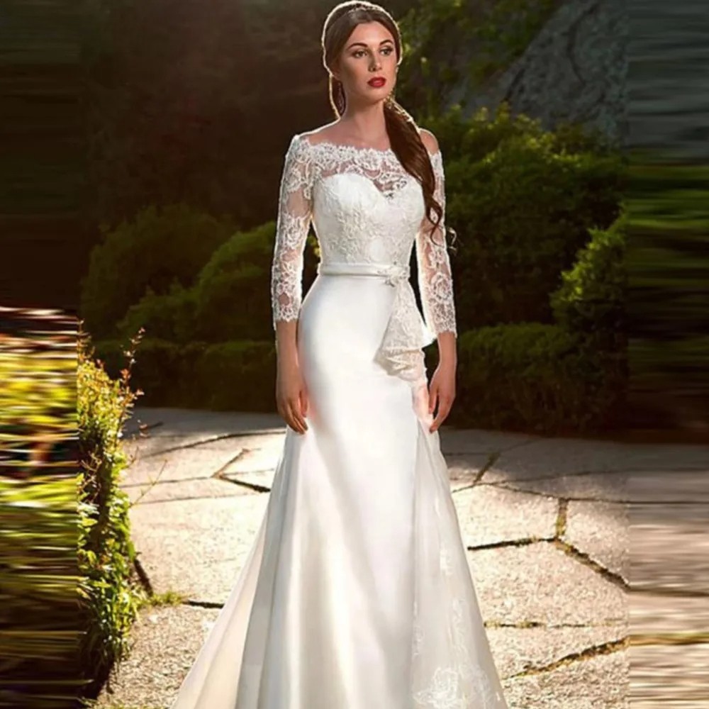 как выглядит Elegant Mermaid Wedding Dresses Strapless Long Sleeves Lace Applique Bridal Gown фото