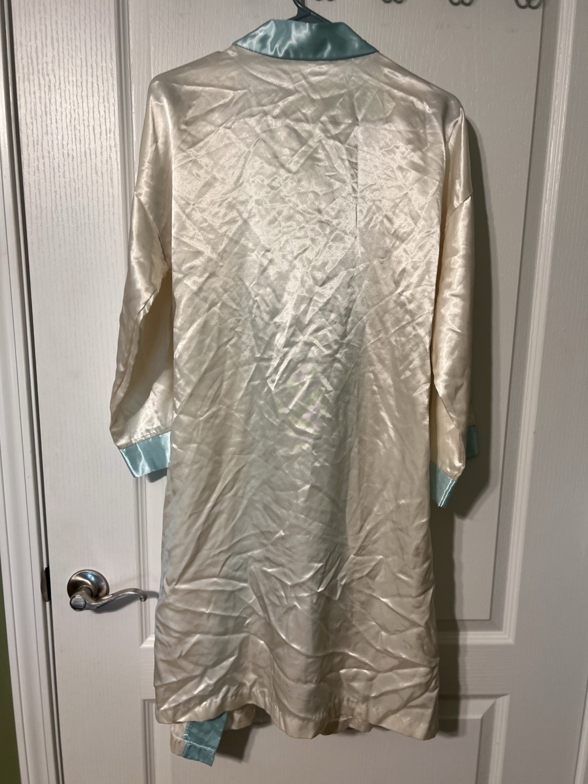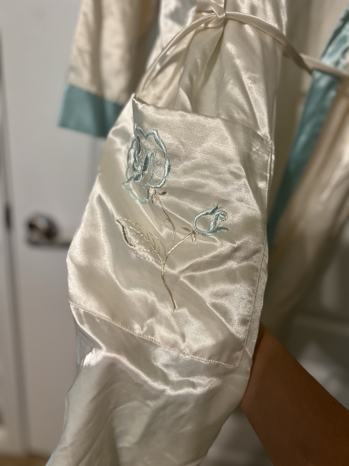 как выглядит Vintage Tara Satin Silk Blue And Cream Colored With Embroidered Floral Pocket M фото