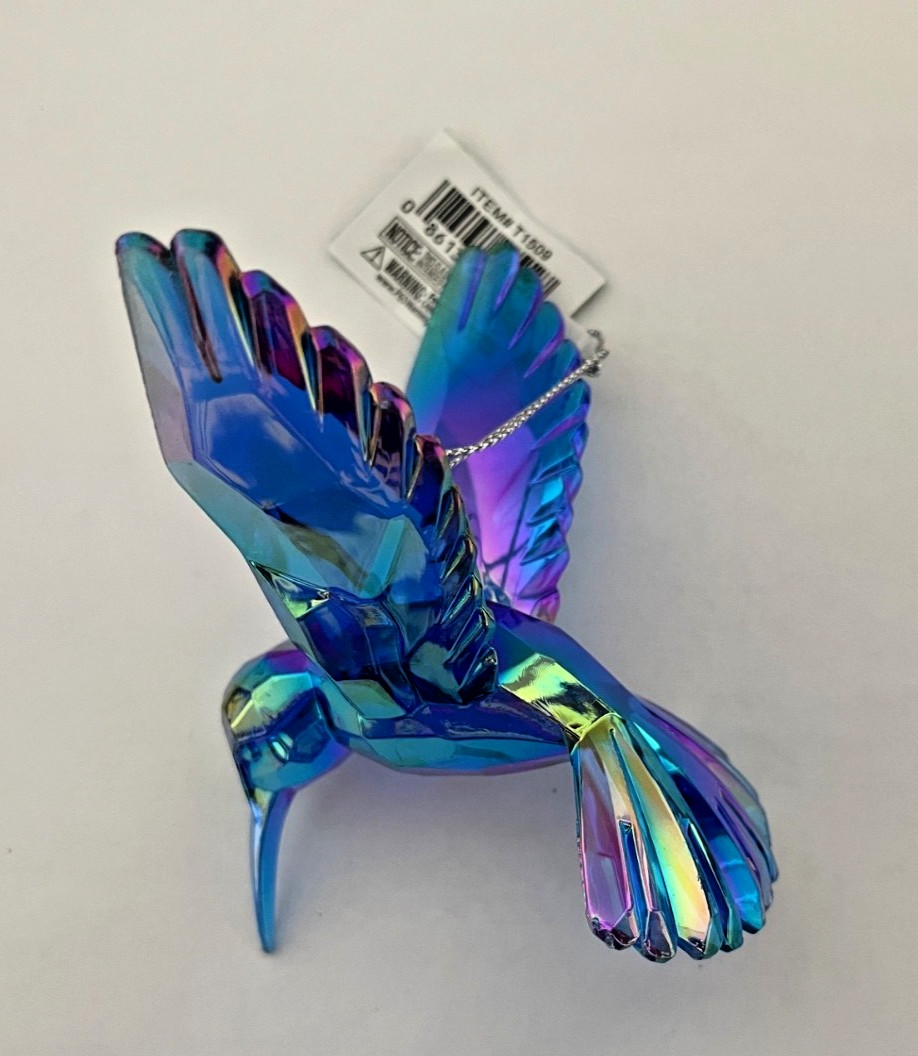 Set/2 Blue Crystal Look Flying Hummingbird ornaments, iridescent acrylic NWT