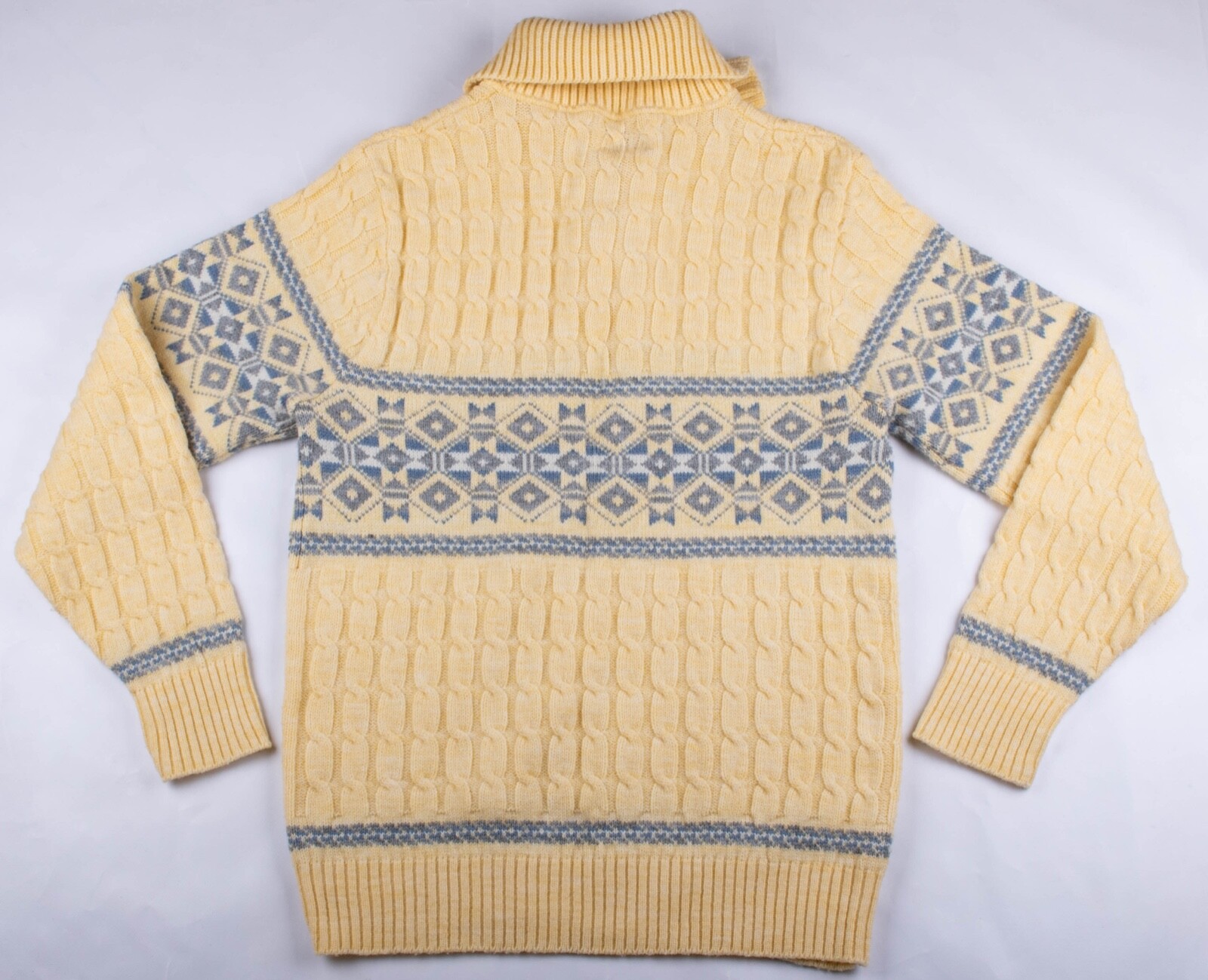 как выглядит Vintage Lord Jeff Cable Knit Yellow/Blue Pattern Thick Sweater US Made Men