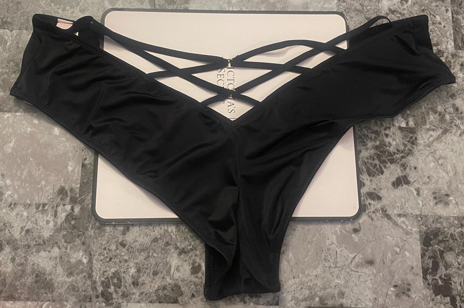 как выглядит NWT VICTORIAS SECRET BLACK SATIN SMOOTH STRAPPY BACK HIGH LEG CHEEKY PANTIES фото