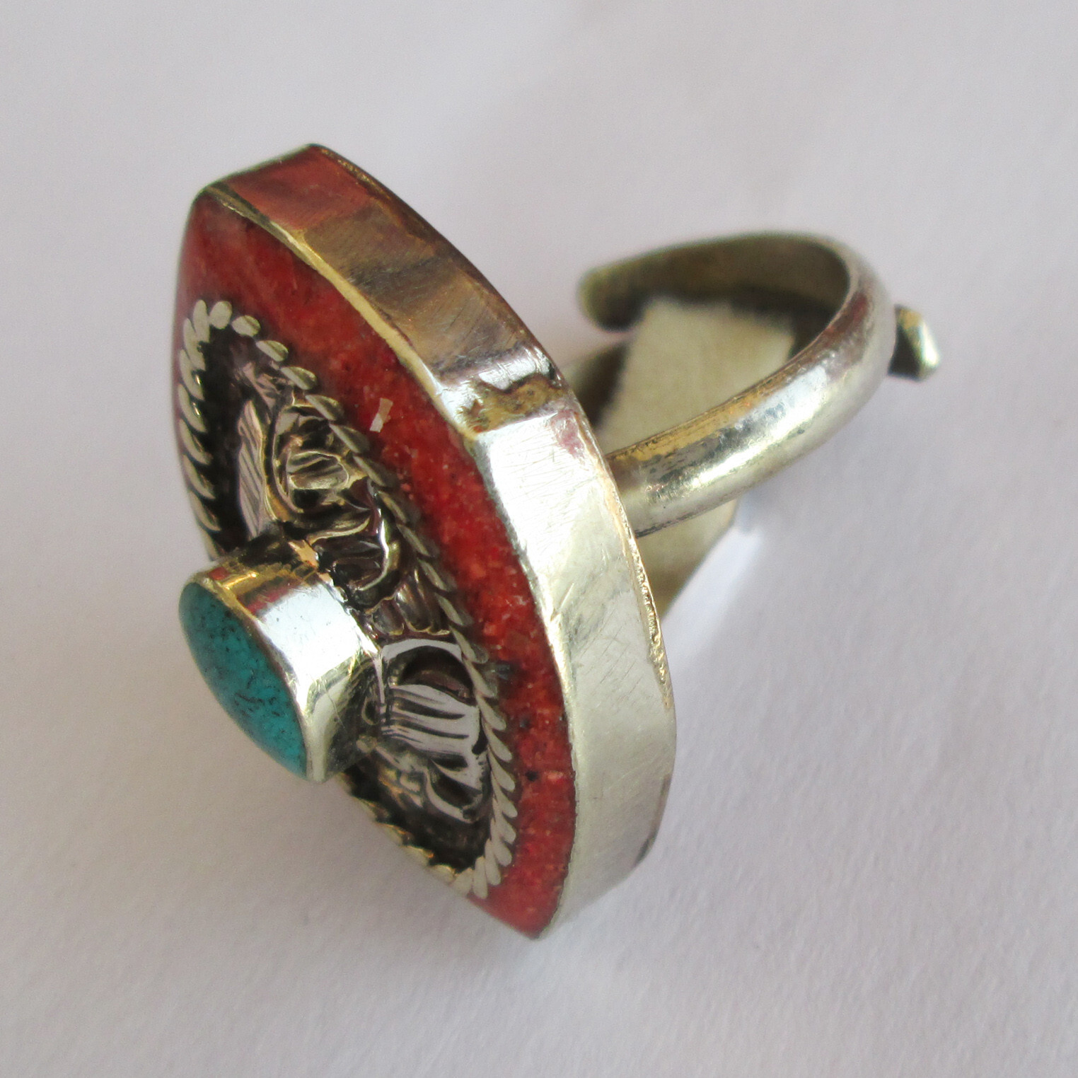 как выглядит Tibetan Silver Turquoise Red Coral Original Jewelry Adjustable Round Ring R32 фото