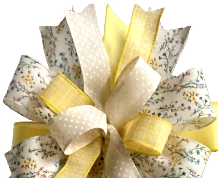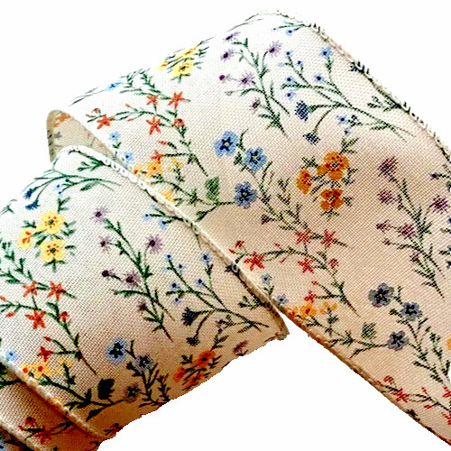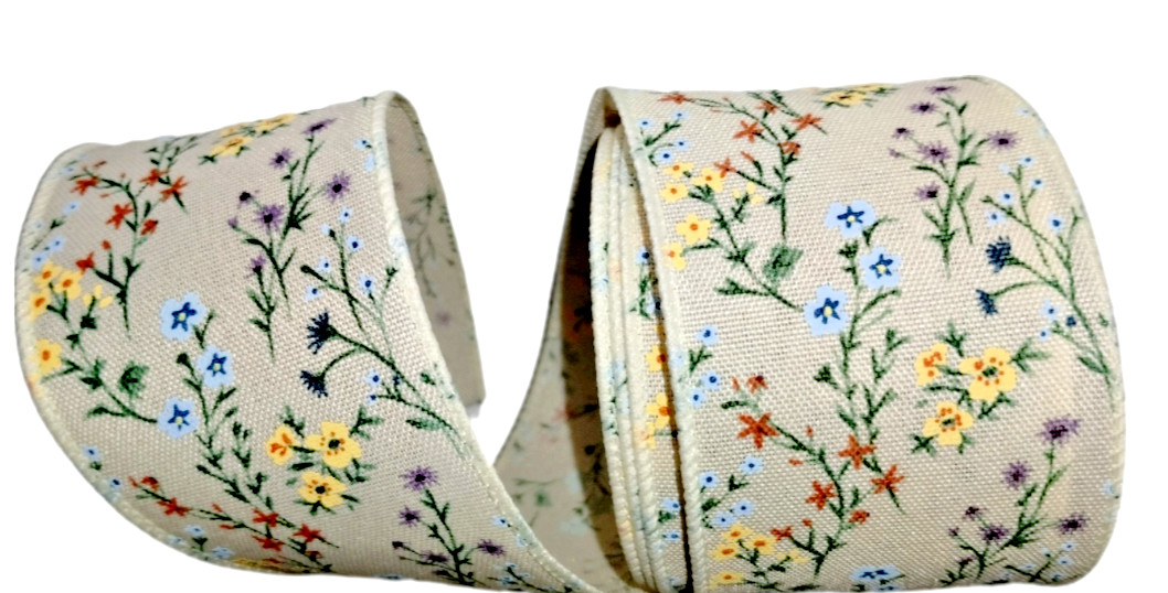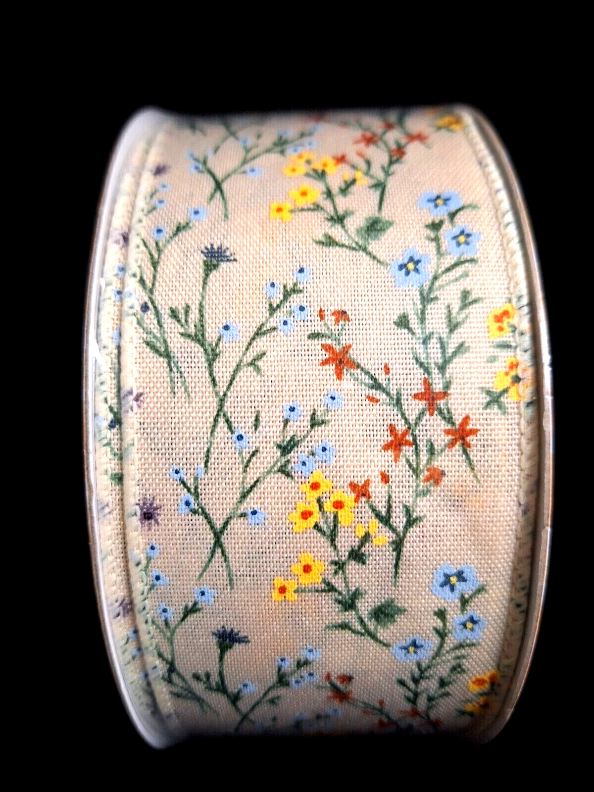 Floral 2.5 by 5 yards Beige Wired Ribbon Summer Wild Flowers Yellow Blue Green
