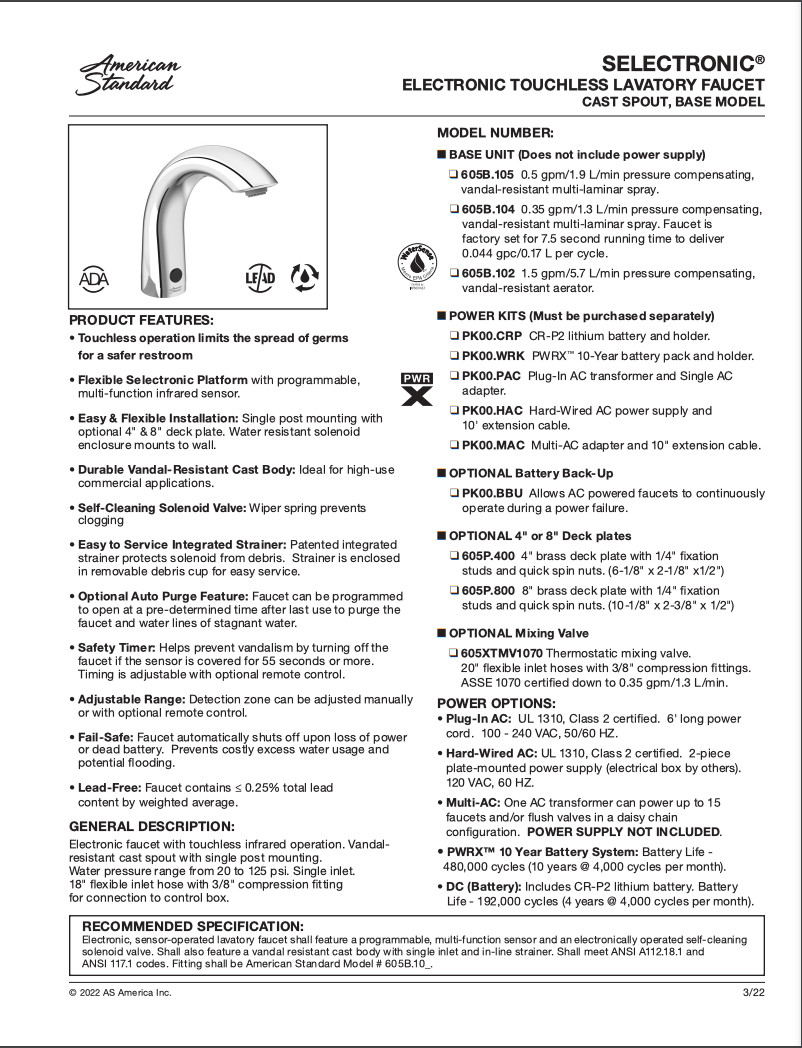 Особенности: American Standard 605B.105 Moments 0.5 GPM Deck