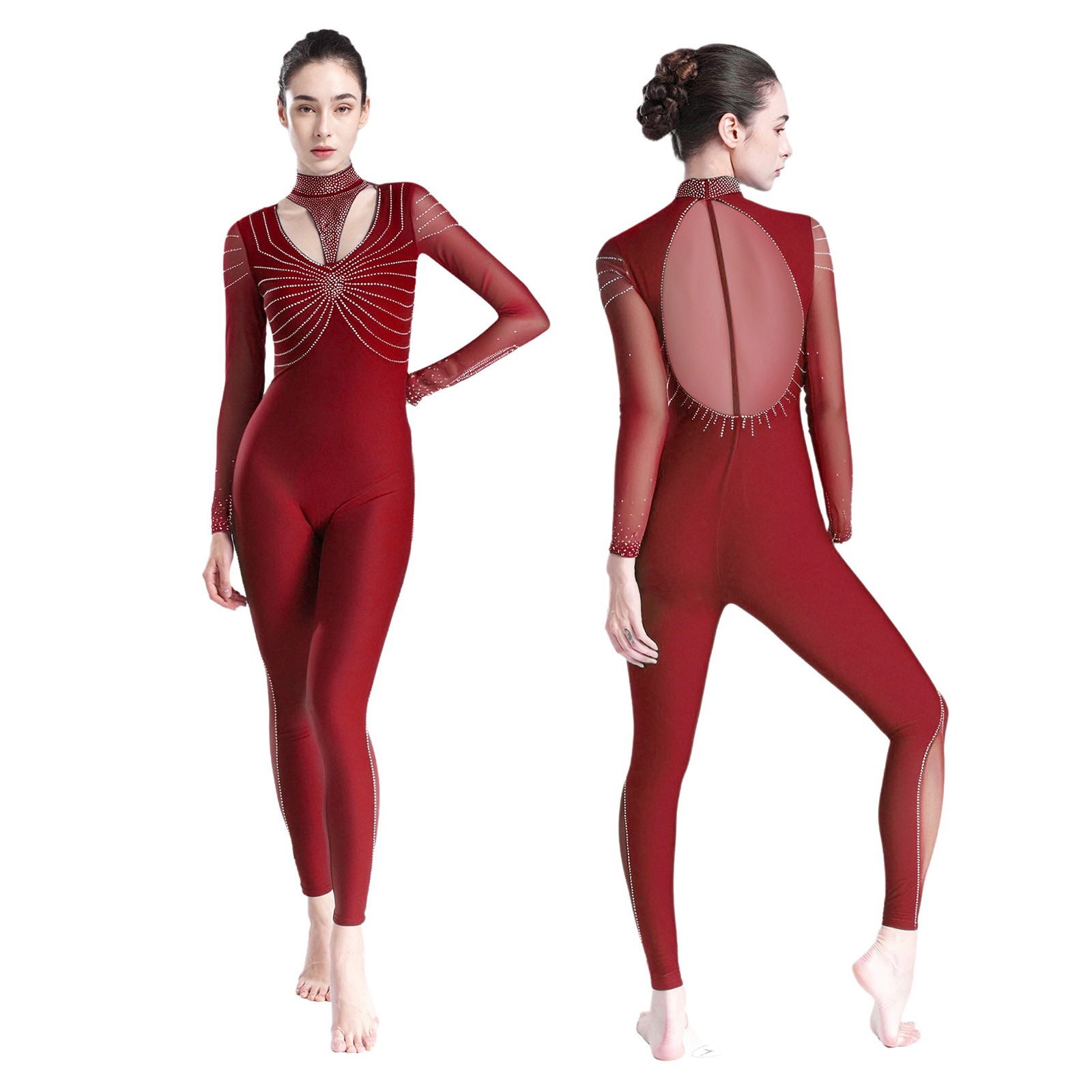 Women Jumpsuit Back Bodysuit Costume Leotard Shiny Dancewear Rompers Mock Neck