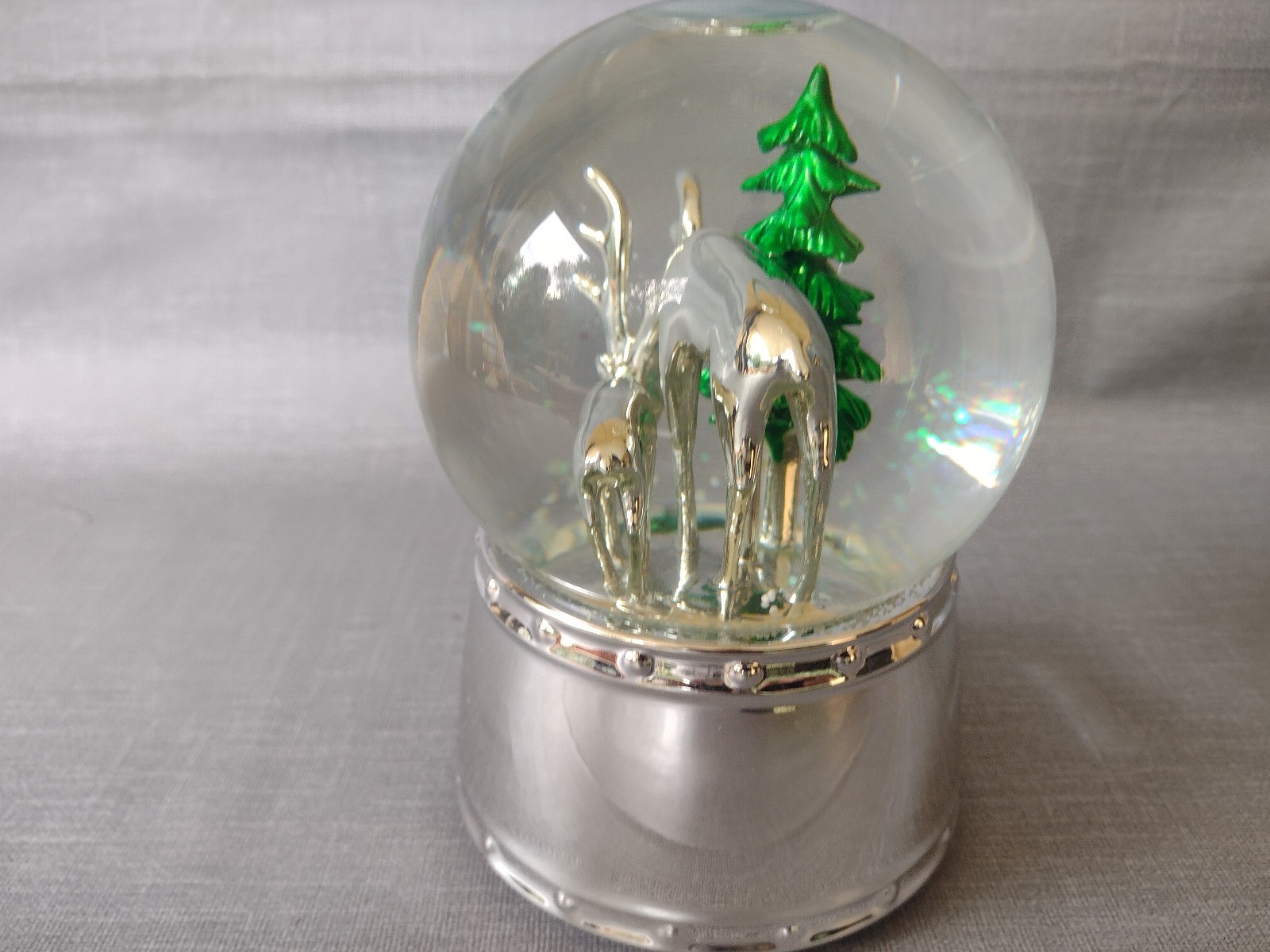 • Silver Reindeer Musical Snow Globe Plays Dashing through the Snow