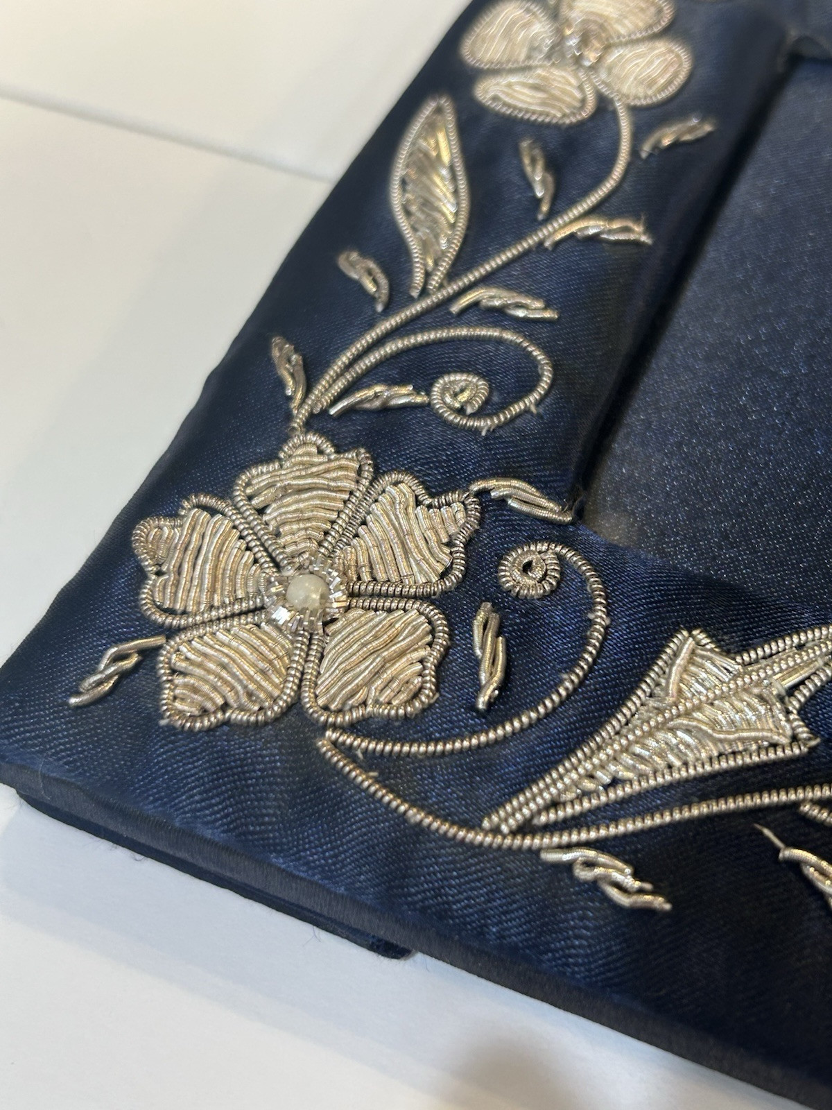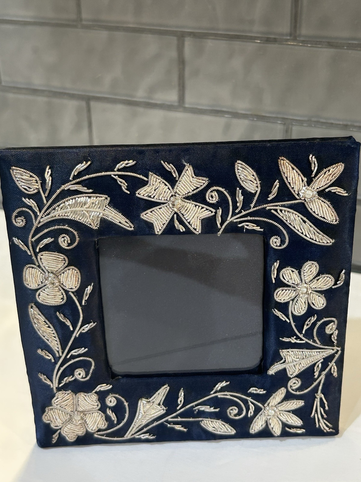 Ornate Beaded Picture Photo Frame Navy Blue Satin Fabric Sequins Floral 6 x 6