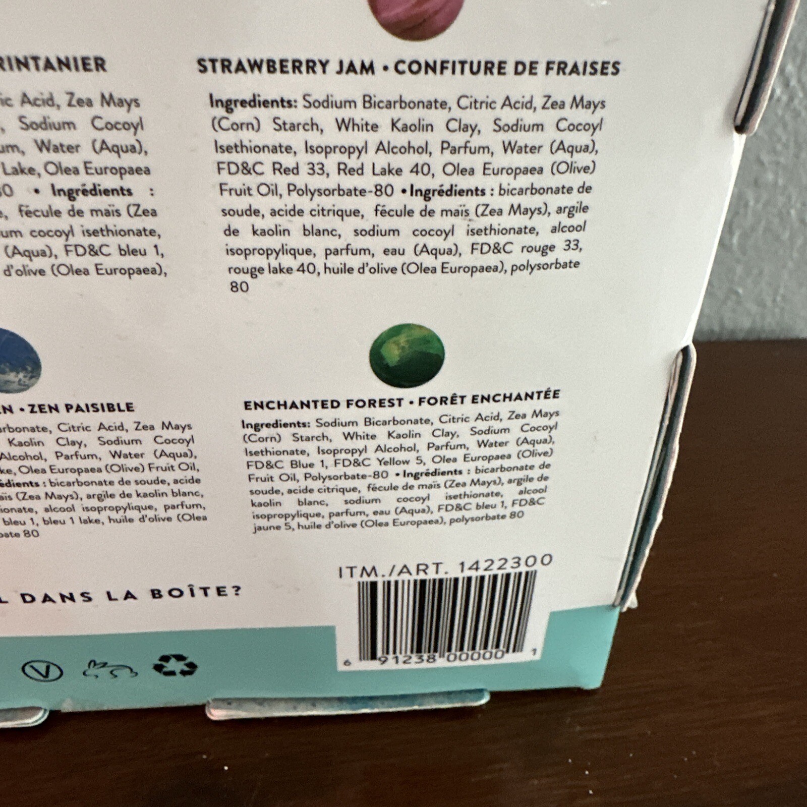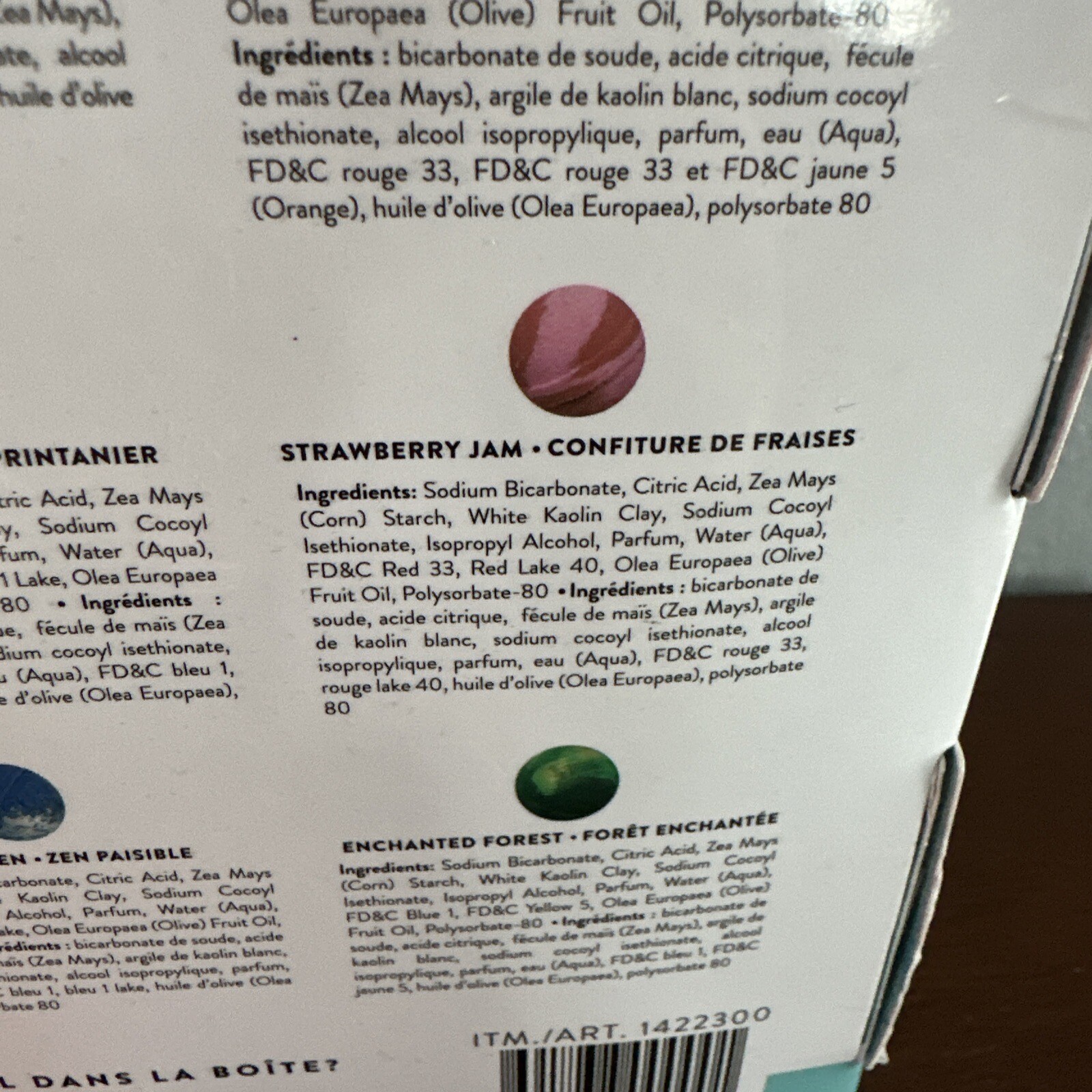 Ingredients: Citric Acid, Sodium Bicarbonate, Zea Mays (Corn) Starch, White Kaolin Clay, Sodium Cocoyl, Sodium Cocoyl Isethionate, Isopropyl Alcohol, Parfum, Water, Polysorbate-80, FD&C Colors, Olea Europaea (Olive) Fruit Oil