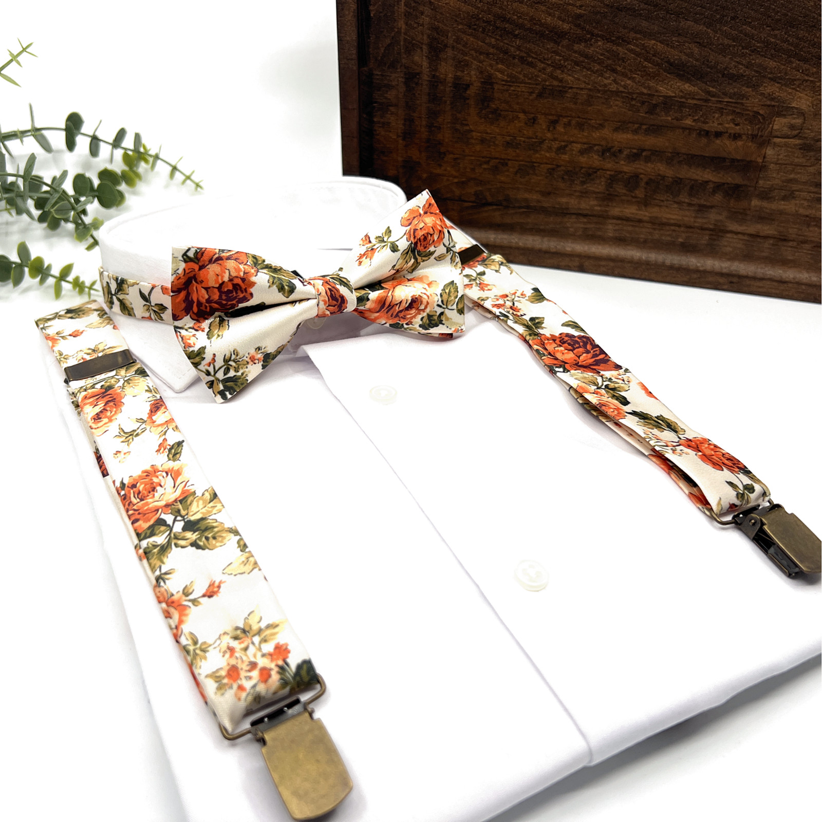 Rose Burnt Orange Floral Suspenders and Bow Tie Set on Ecru Background