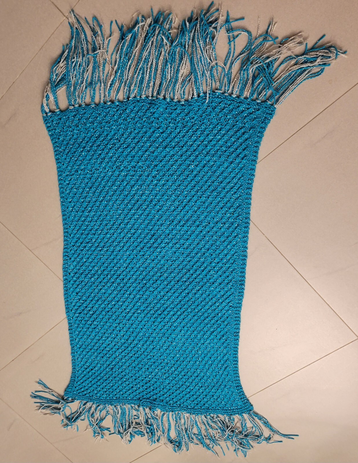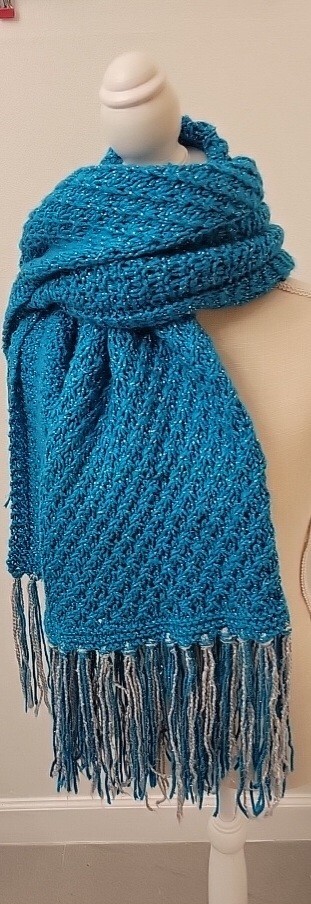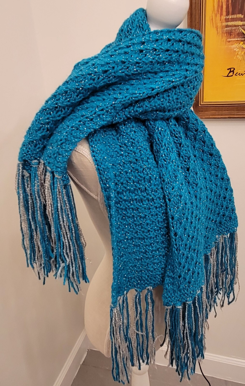 Shawl Teal Blue/Silver Metalic Knite Oversize Tassel Wrap Scarf Xmas Handcrafted