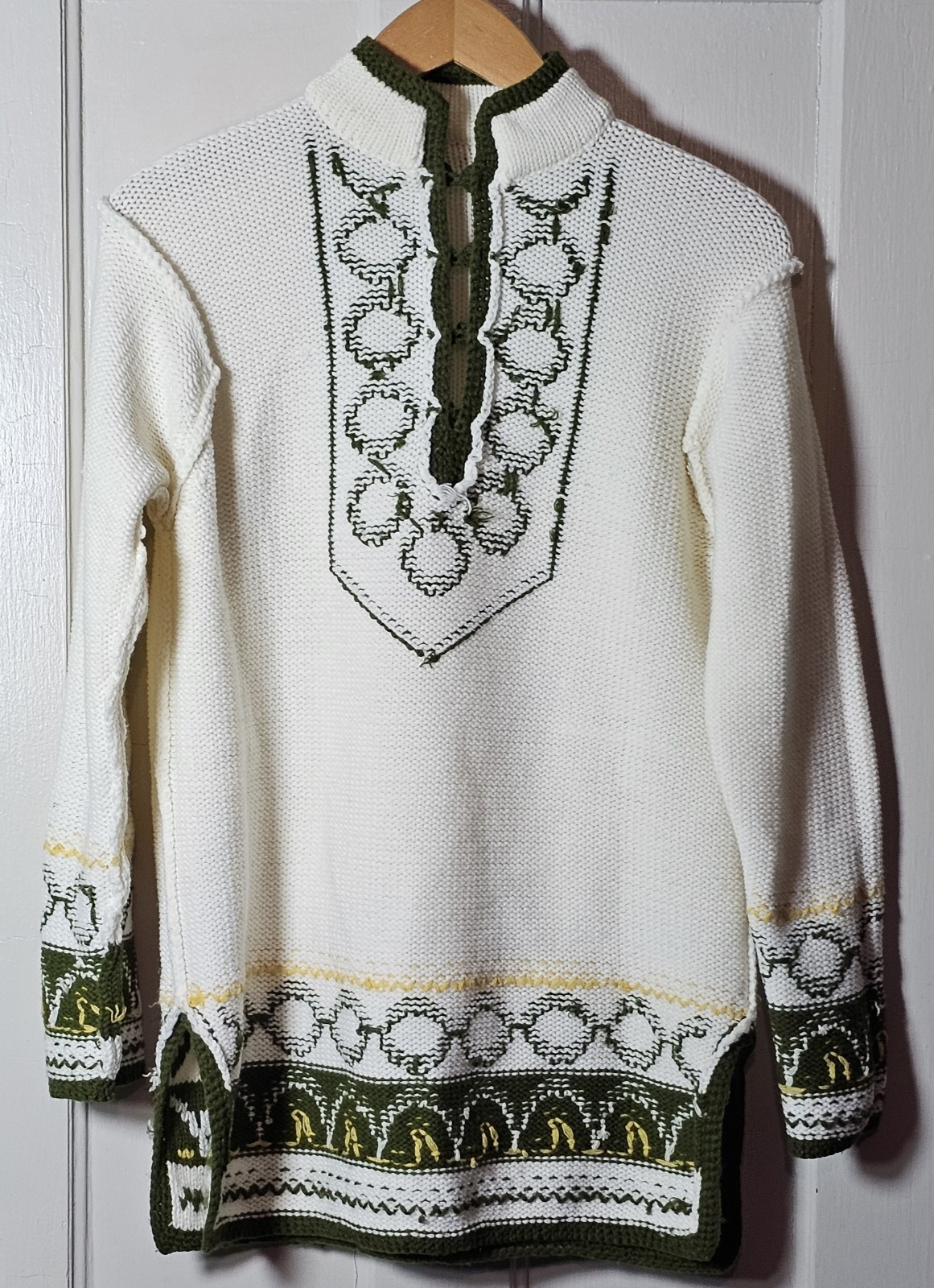 как выглядит Vtg 1960s Charmette Sweater Size M White Olive Tunic Knit Button Placket Hippie фото