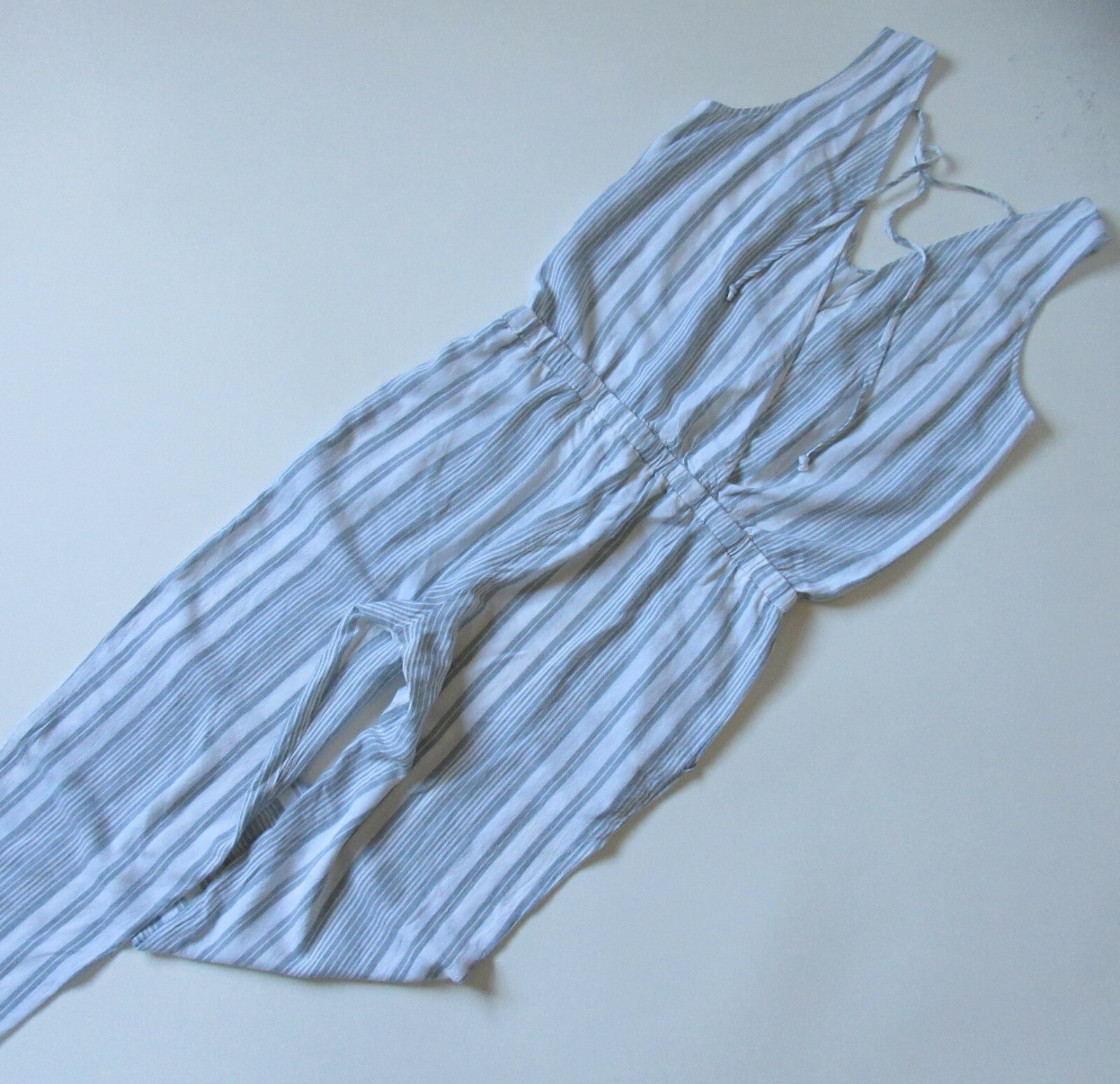 как выглядит NWoT Anthropologie Cloth Stone Jumper in Gray Striped Cross Back Jumpsuit M фото