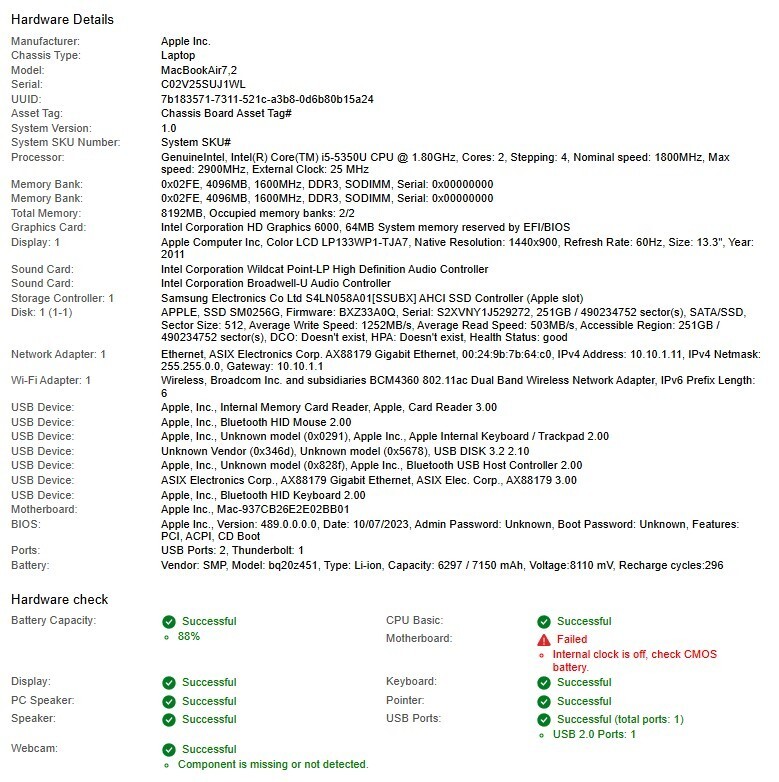 Apple MacBookAir7,2 i5-5350U, 8GB RAM, 251GB SATA/SSD No AC/OS