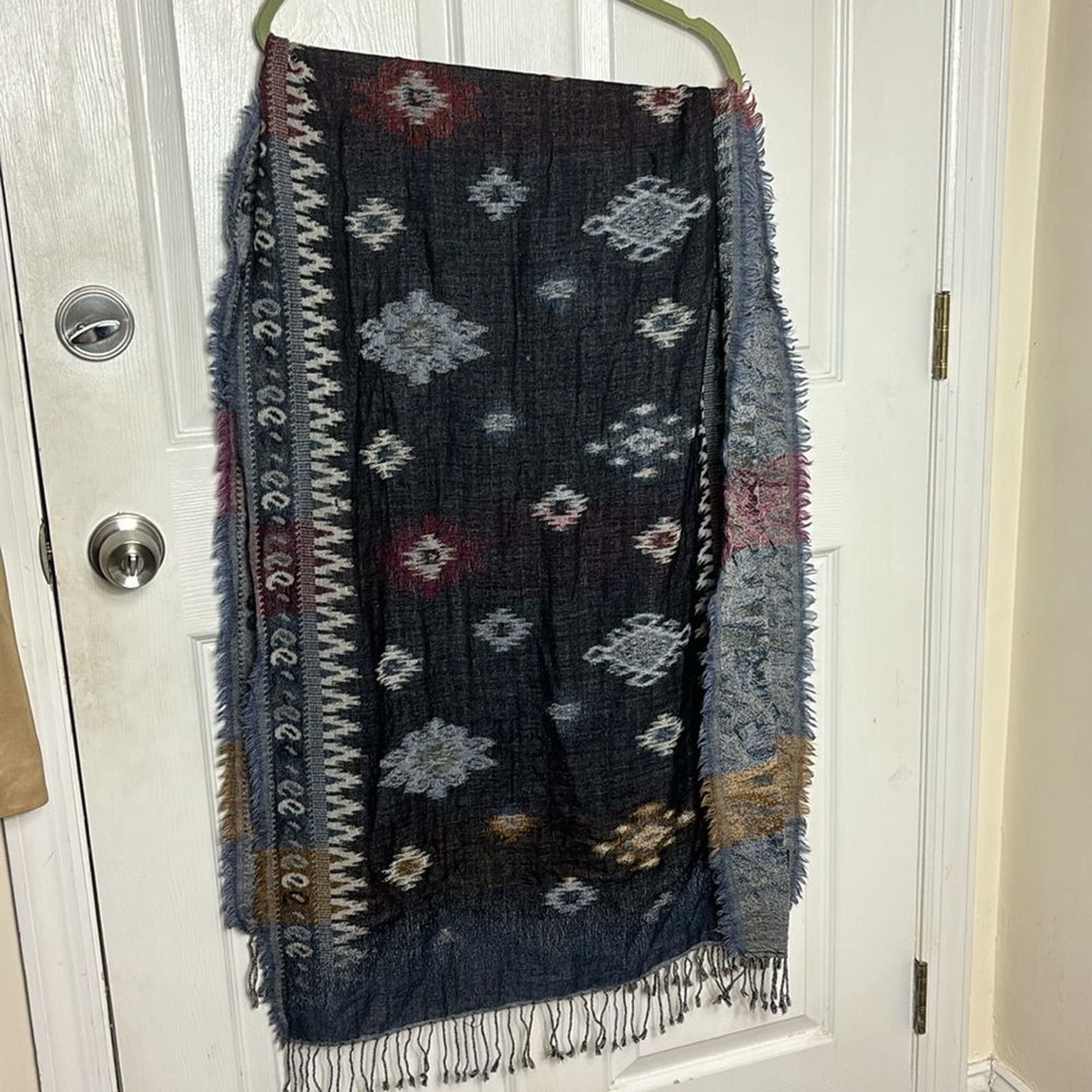 Navy Blue Aztec print wool scarf with fringe Lightweight Scarf