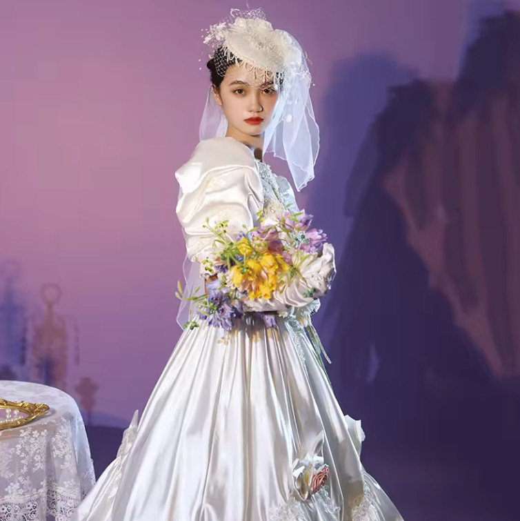 Vintage White Satin Flower Lace Wedding Dresses with Big Bow Puff Sleeves