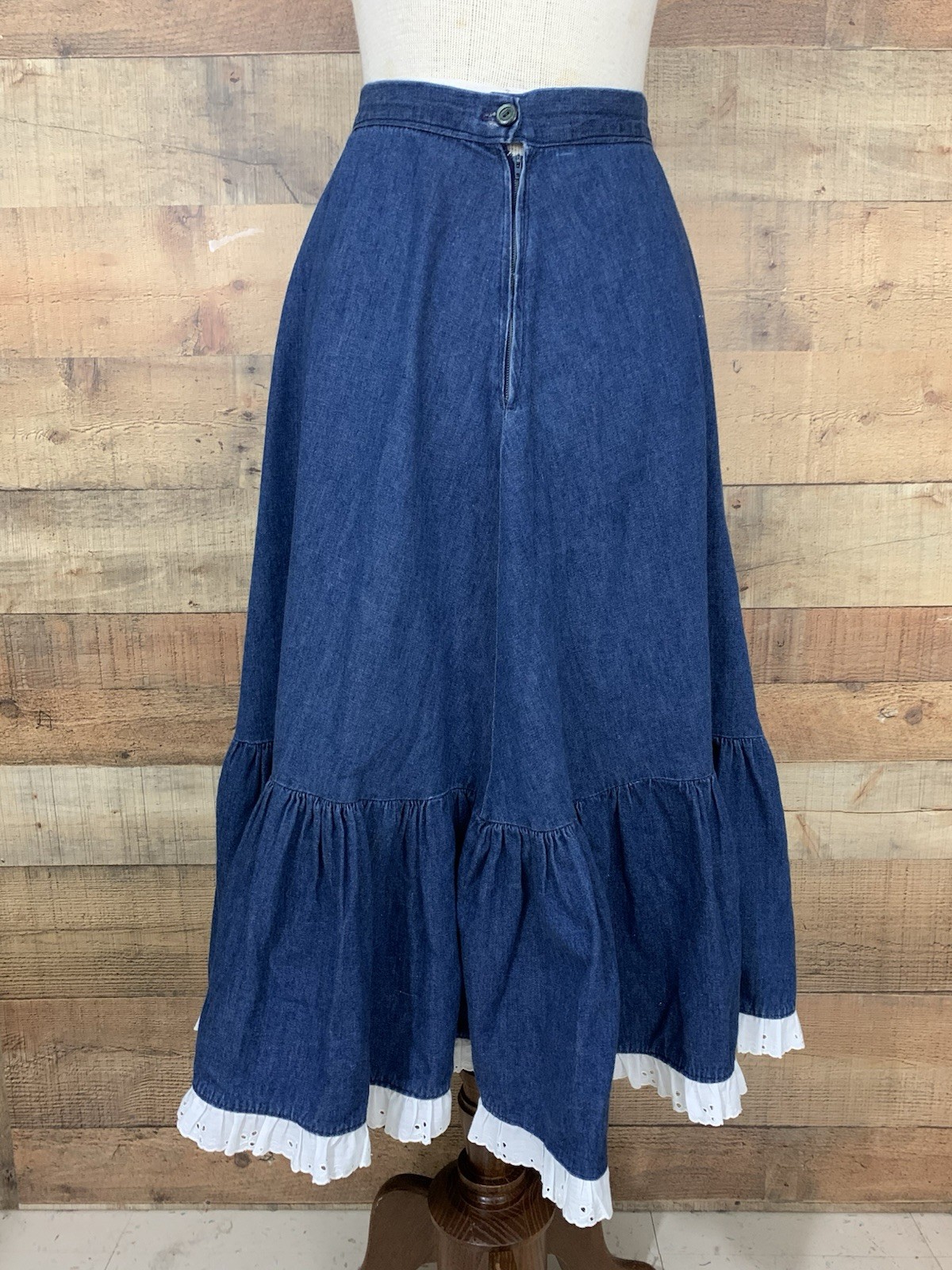 как выглядит Vintage 1970 s Prairie Boho Western Denim Ruffled Maxi Skirt Waist 25 фото