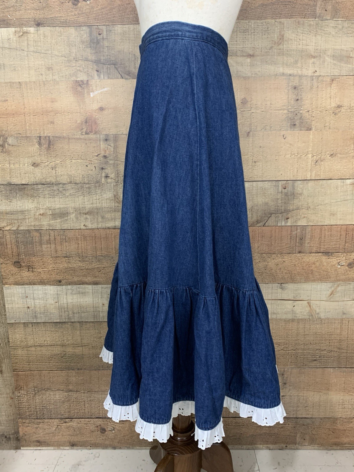Vintage 1970 s Prairie Boho Western Denim Ruffled Maxi Skirt Waist 25