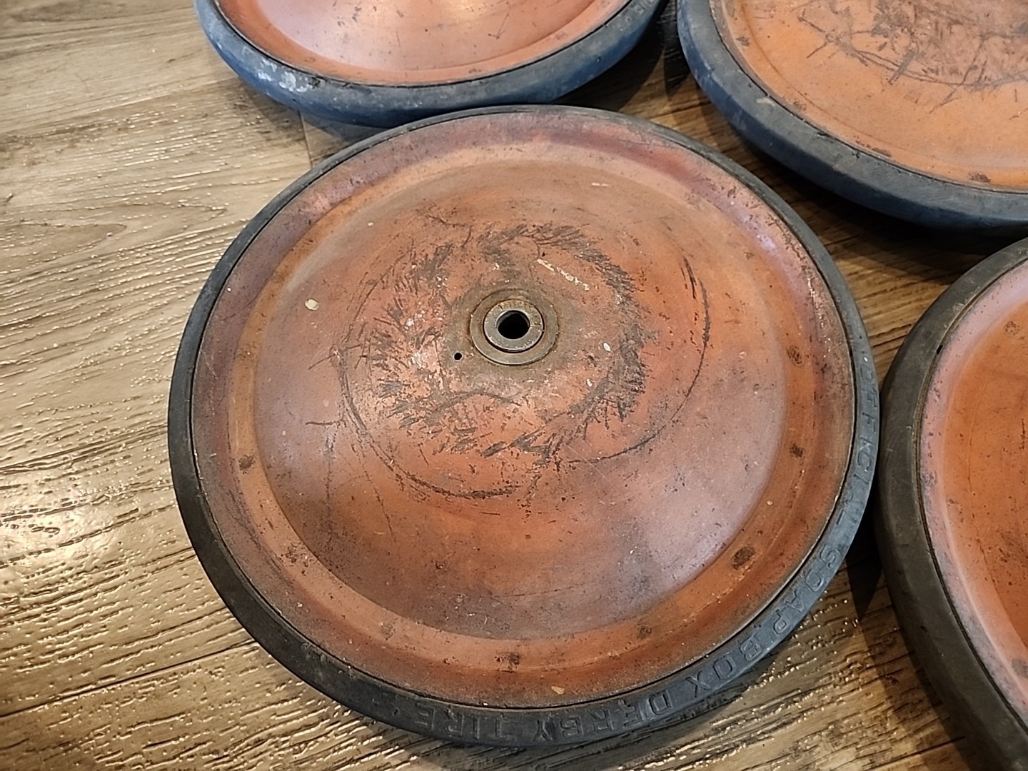 как выглядит 4 Vintage Official Soap Box Derby Wheels Tires Good Condition фото