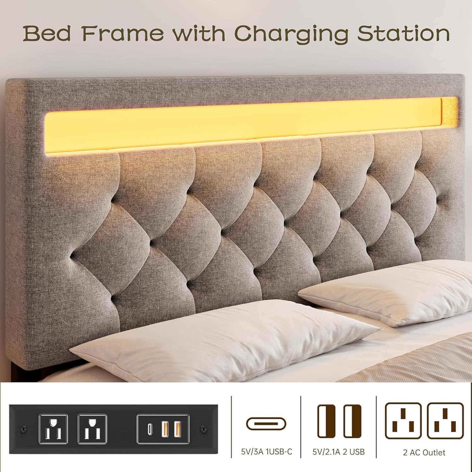 Queen Bed Frame Headboard, Upholstered Platform LED Bed Frame w/Charging Station