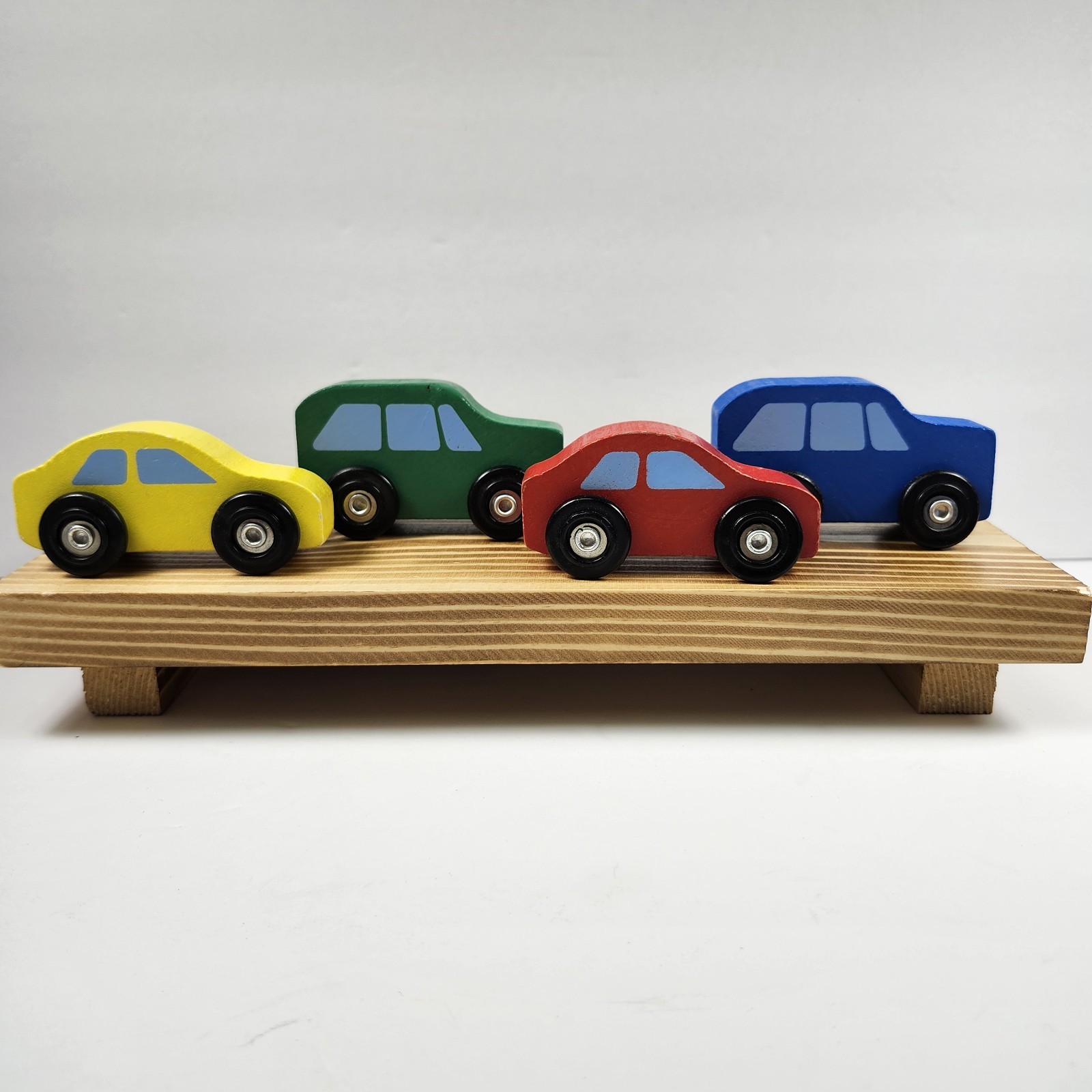 как выглядит Melissa and Doug Wooden Car Lot of 4 Blue Red Yellow Green Magnetic Montessori фото