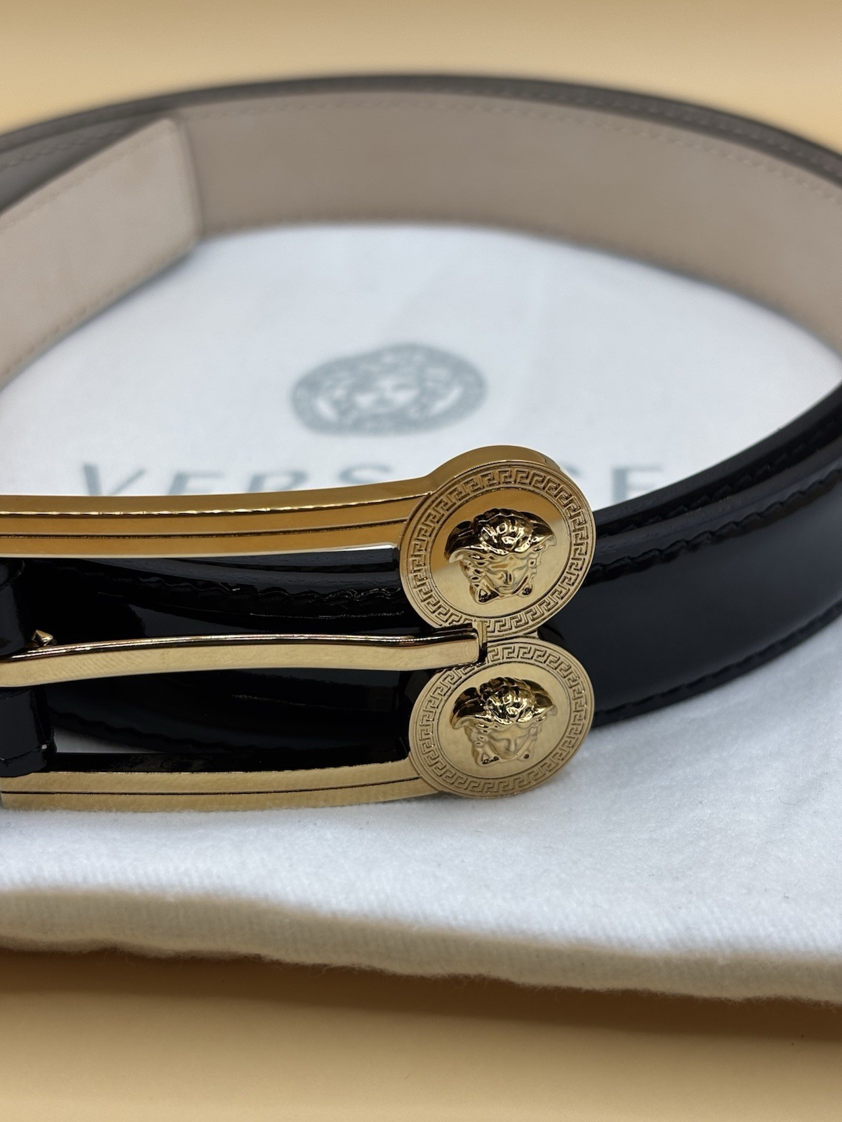 как выглядит Versace Belt Patent Leather Metal Black And Gold 90 36 Authentic 600 Retail фото