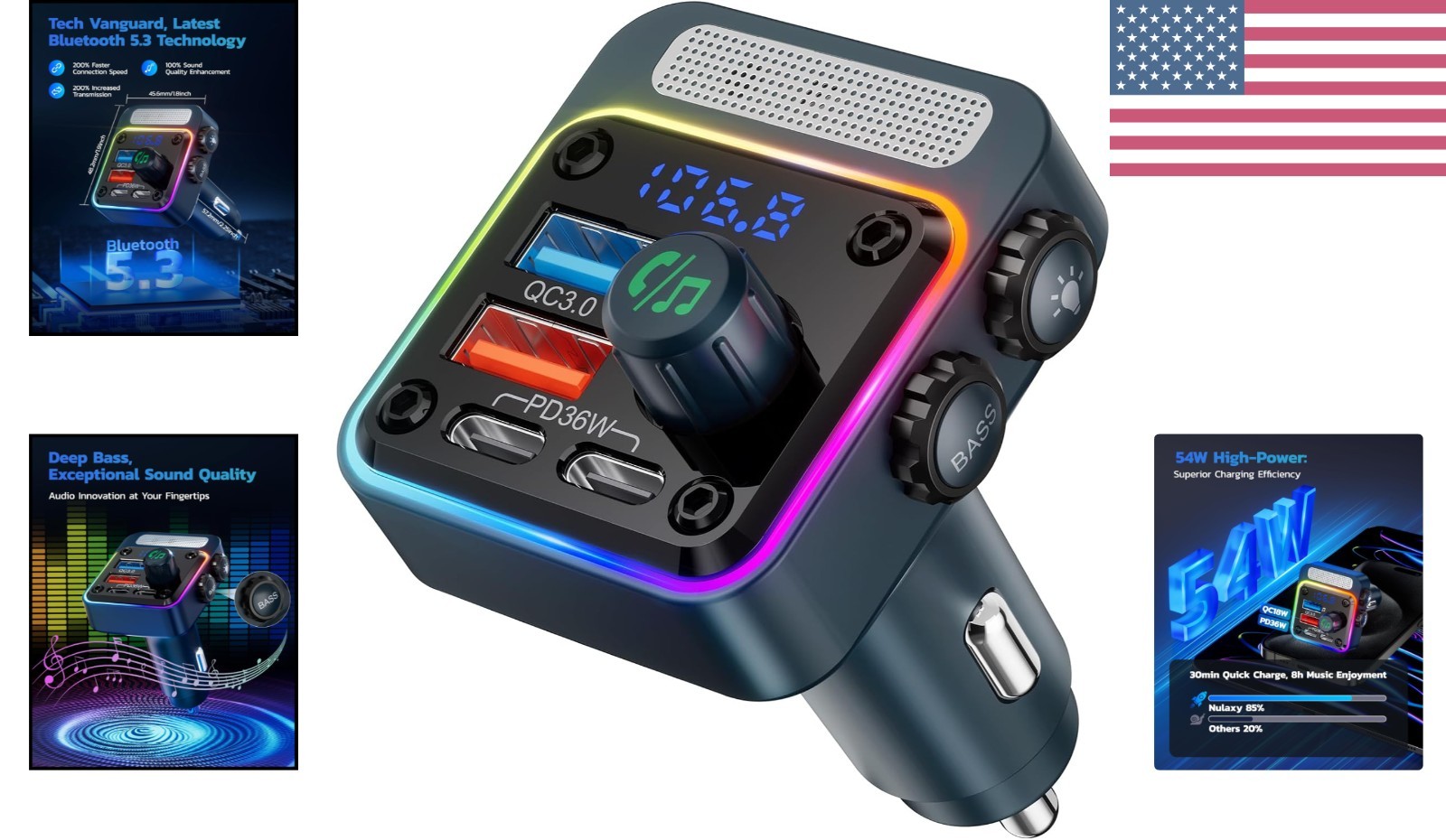 54W Bluetooth 5.3 Car Adapter with 4 Charging Ports LED Lighting