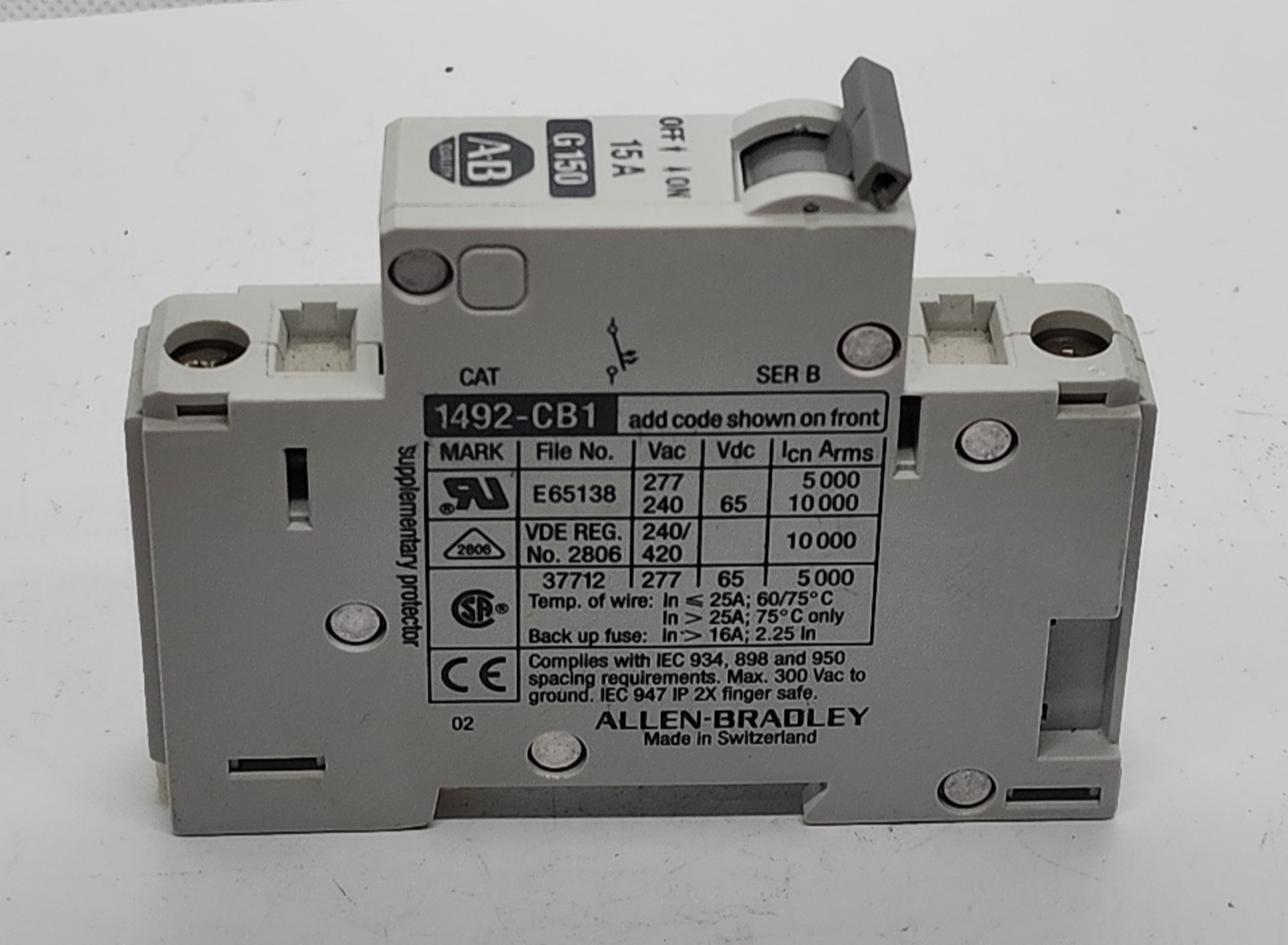 как выглядит ALLEN BRADLEY 1492-CB1G150 SER B 15A 1 POLE 277V CIRCUIT BREAKER 2WS1-2 фото