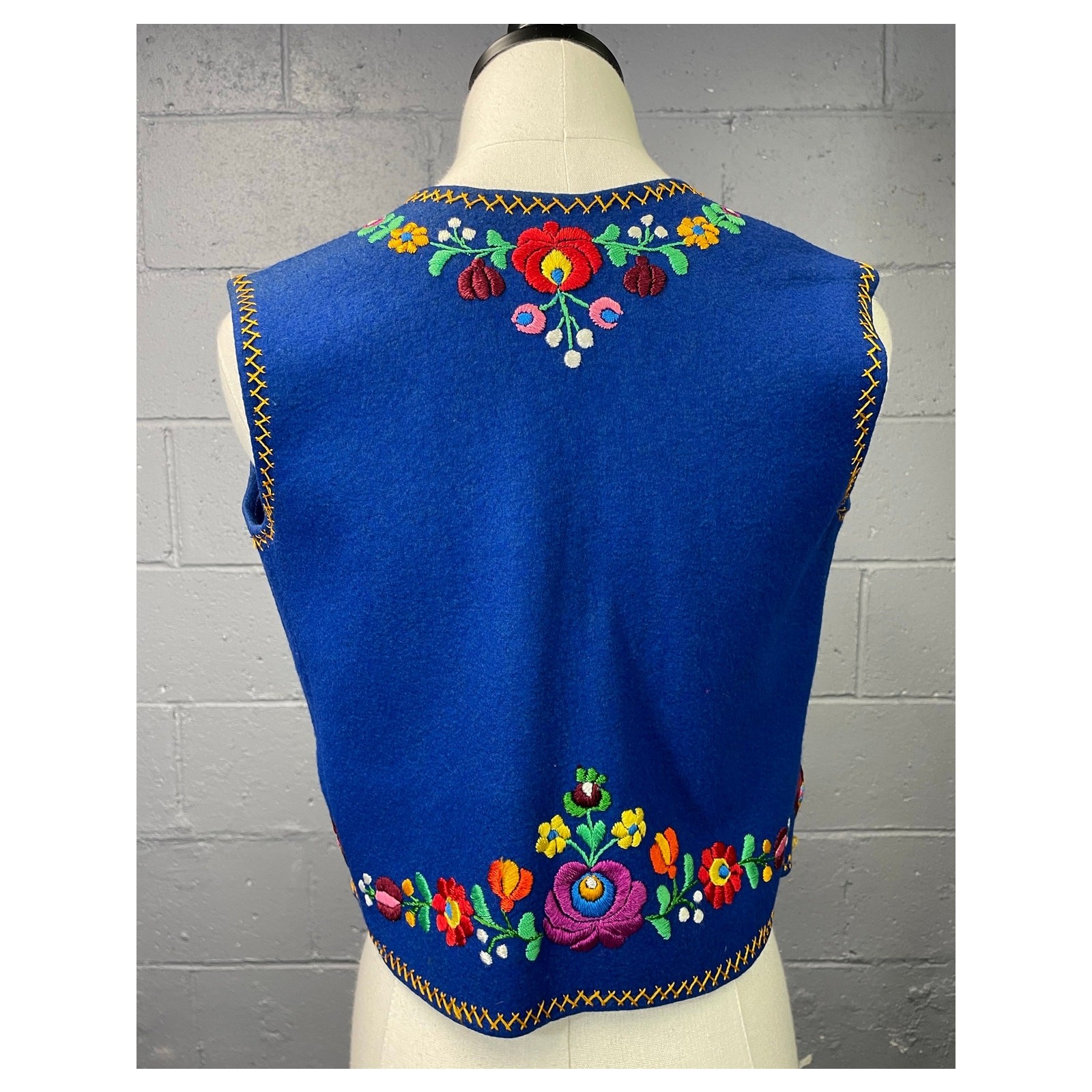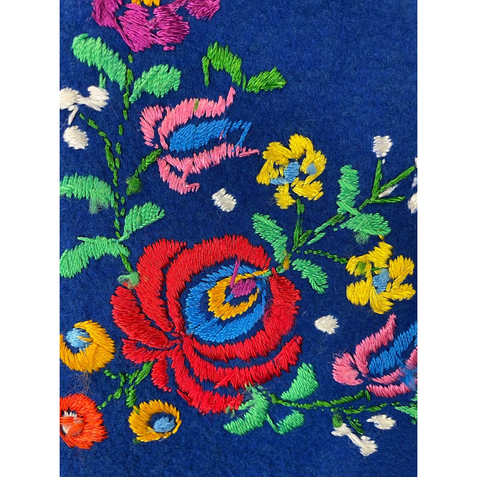 Vintage 60s Blue Wool Felt Vest Hand Embroidered Floral Hungarian Folk Cottage