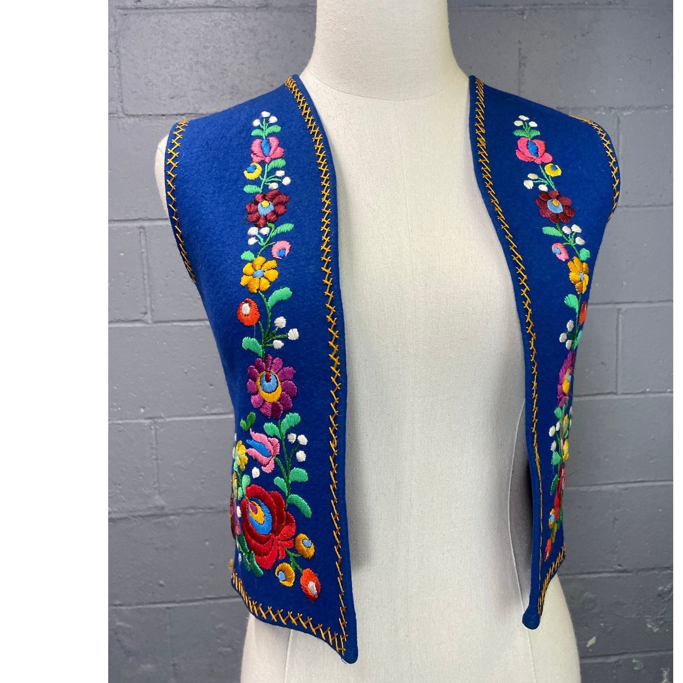 как выглядит Vintage 60s Blue Wool Felt Vest Hand Embroidered Floral Hungarian Folk Cottage фото