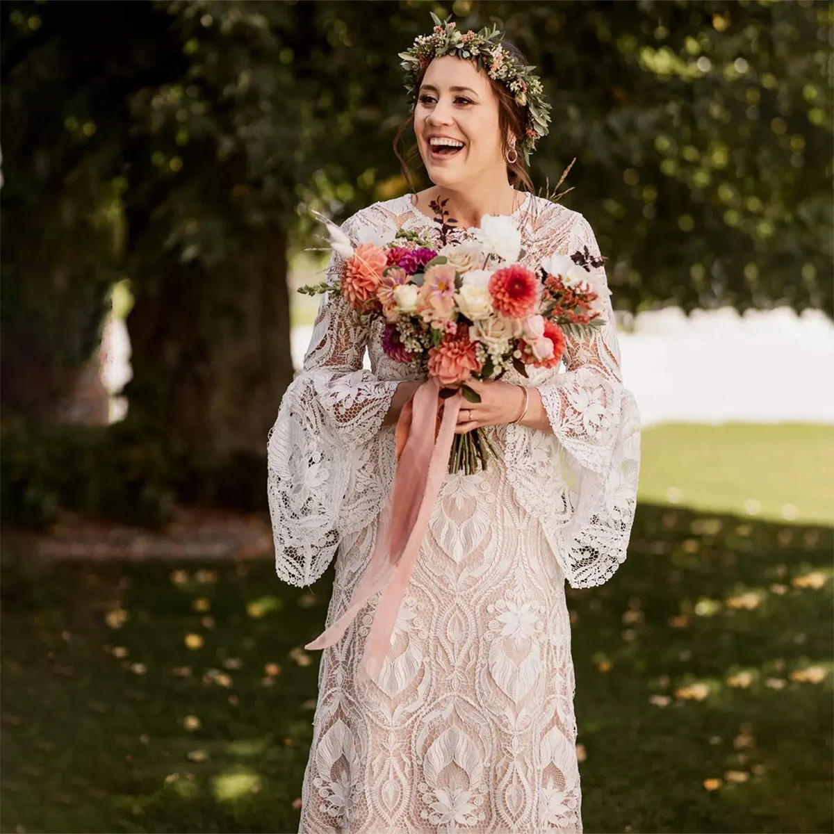 Boho A-Line Wedding Dresses O-Neck 3/4 Flare Sleeves Lace Appliques Bridal Gowns