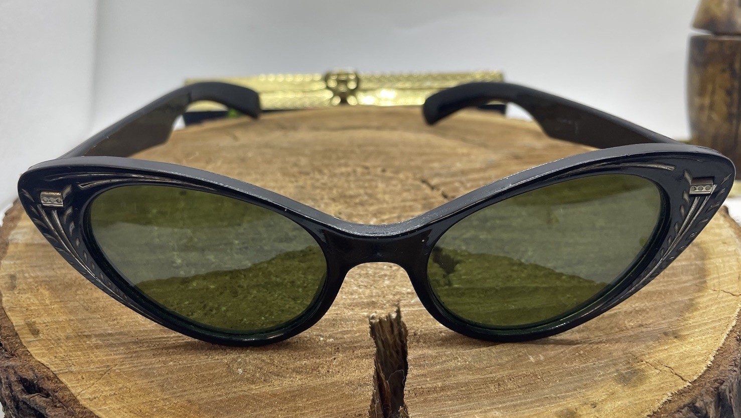 как выглядит VTG. 50S 60S Cat Eye Sunglasses Carved Black Nylon Frame GREEN LENS W/Case фото