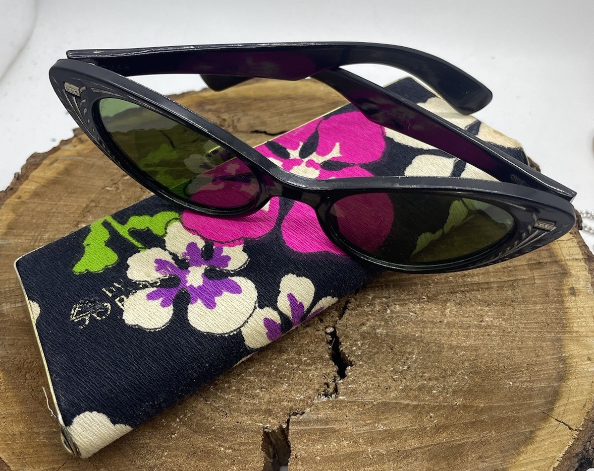 VTG. 50'S 60'S Cat Eye Sunglasses Carved Black Nylon Frame GREEN LENS W/Case