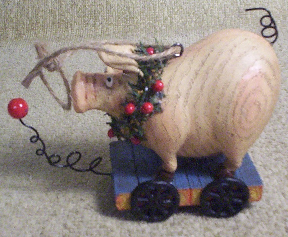 как выглядит 2 DIFF VINTAGE RESIN CHRISTMAS ORNAMENTS - PIG ON A 4-WHEEL CART COW ON A CART фото