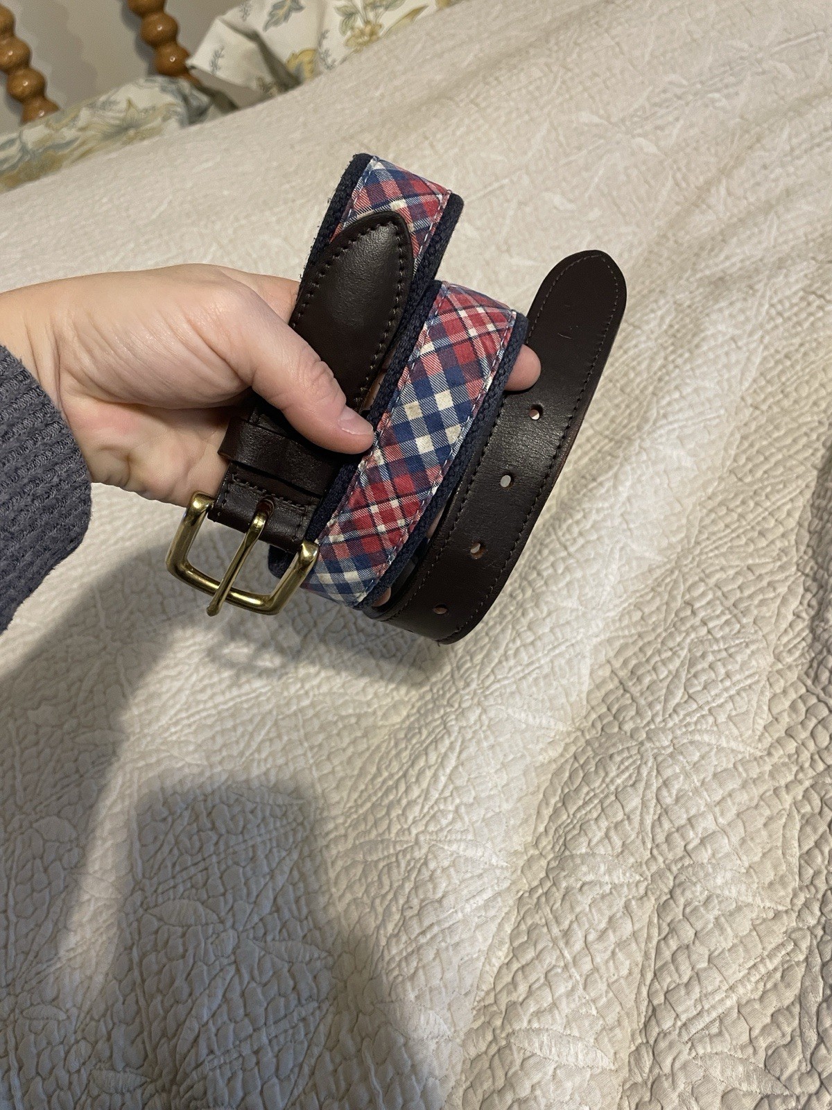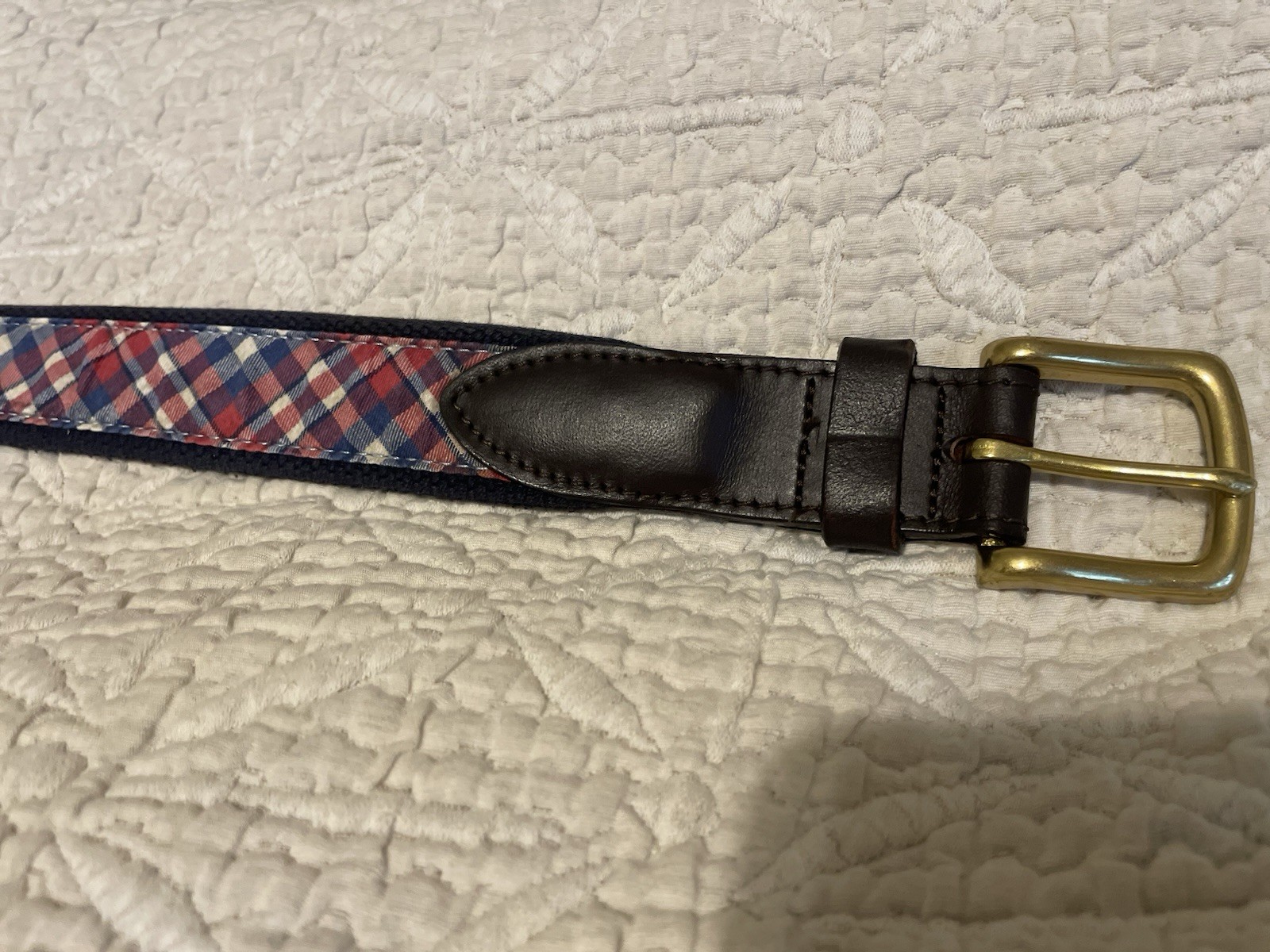 Vineyard Vines Boys Plaid Canvas And Leather Belt Solid Brass Buckle 35 In Long