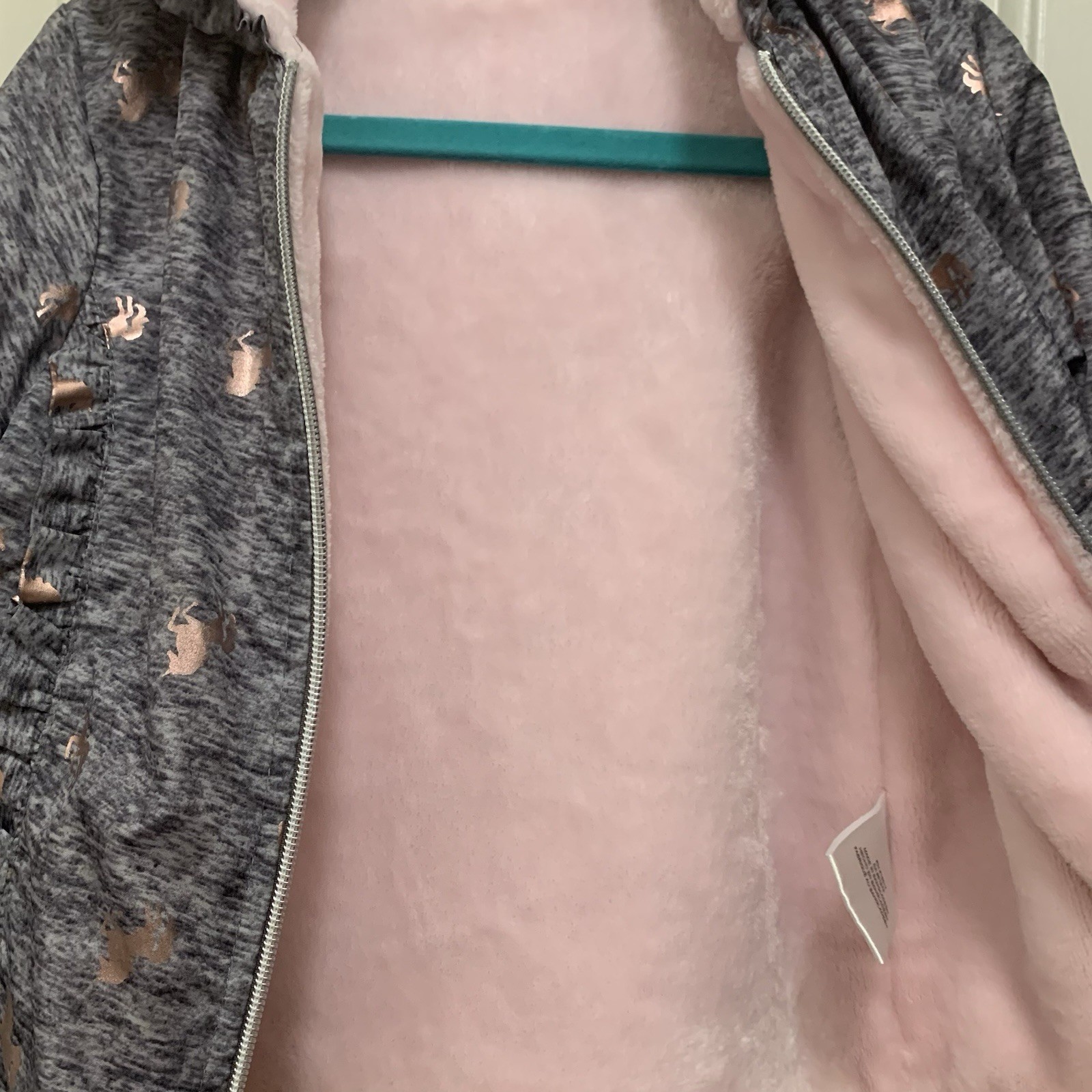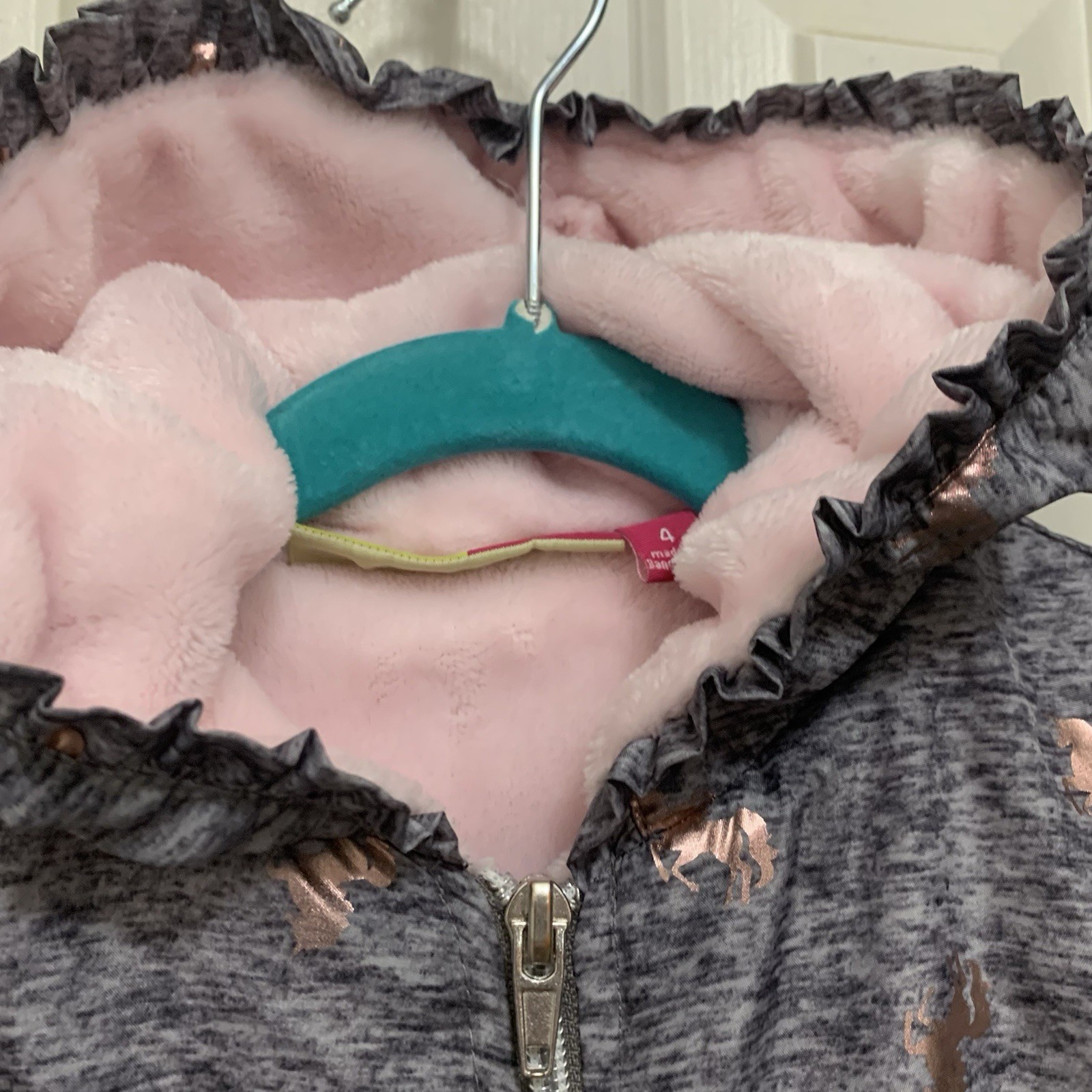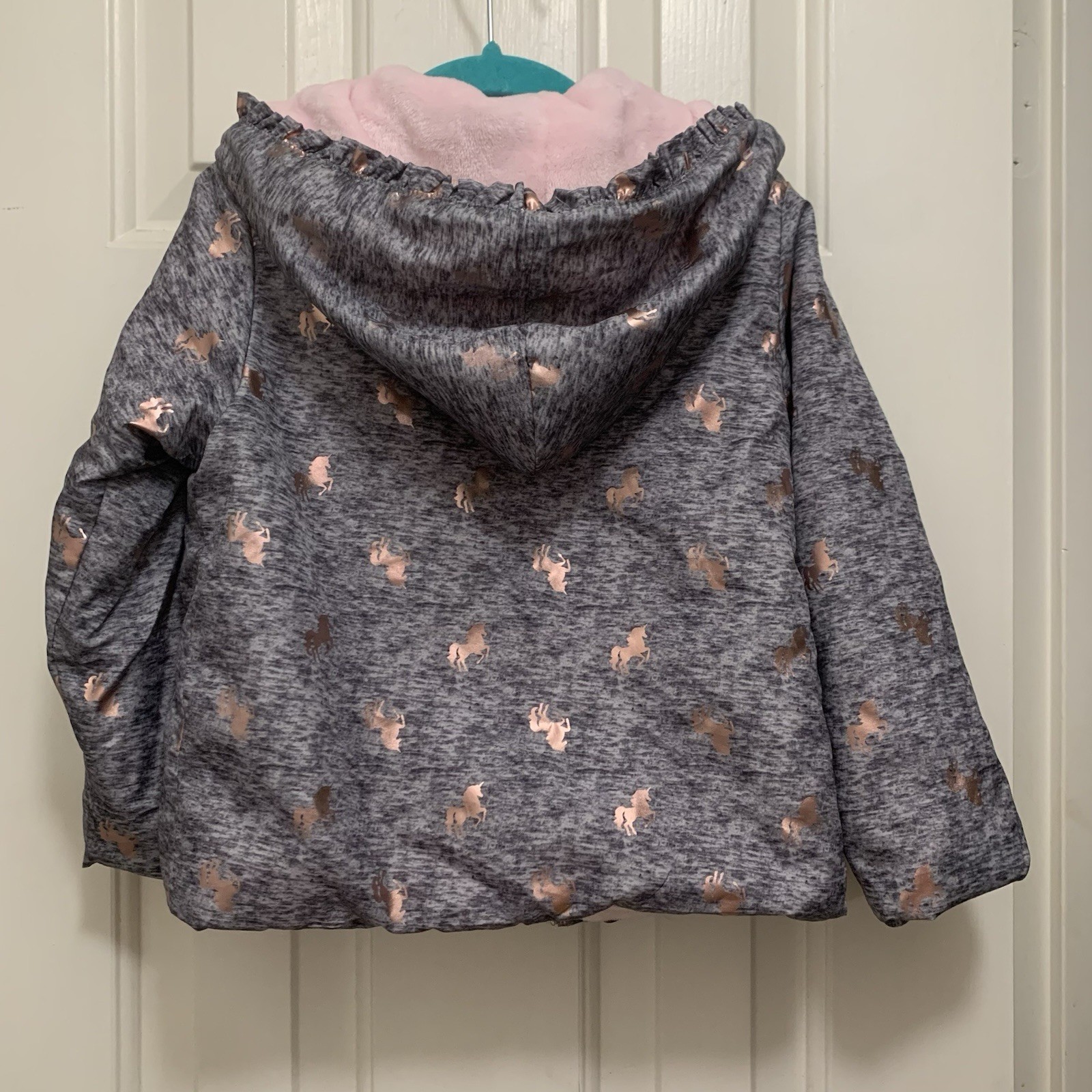 Penelope Mack Girl s Plush Lined Jacket 4 Gray Pink Unicorn Foil Ruffle Hood