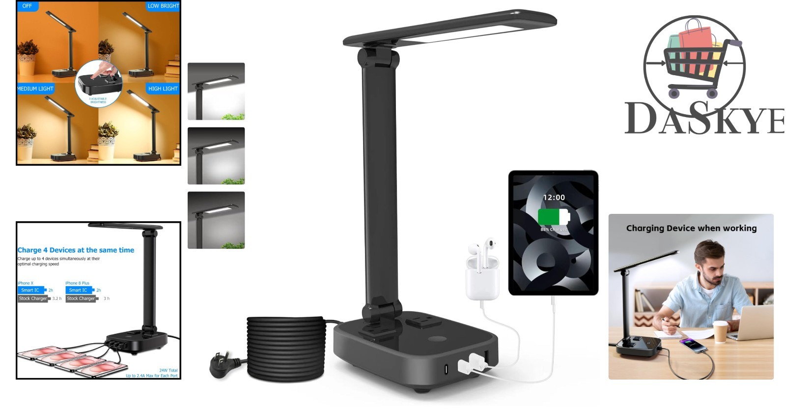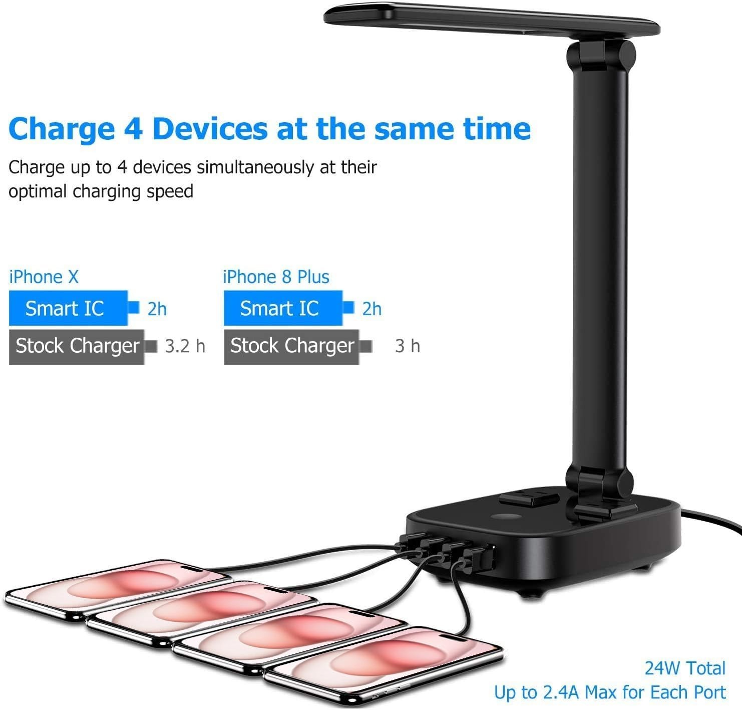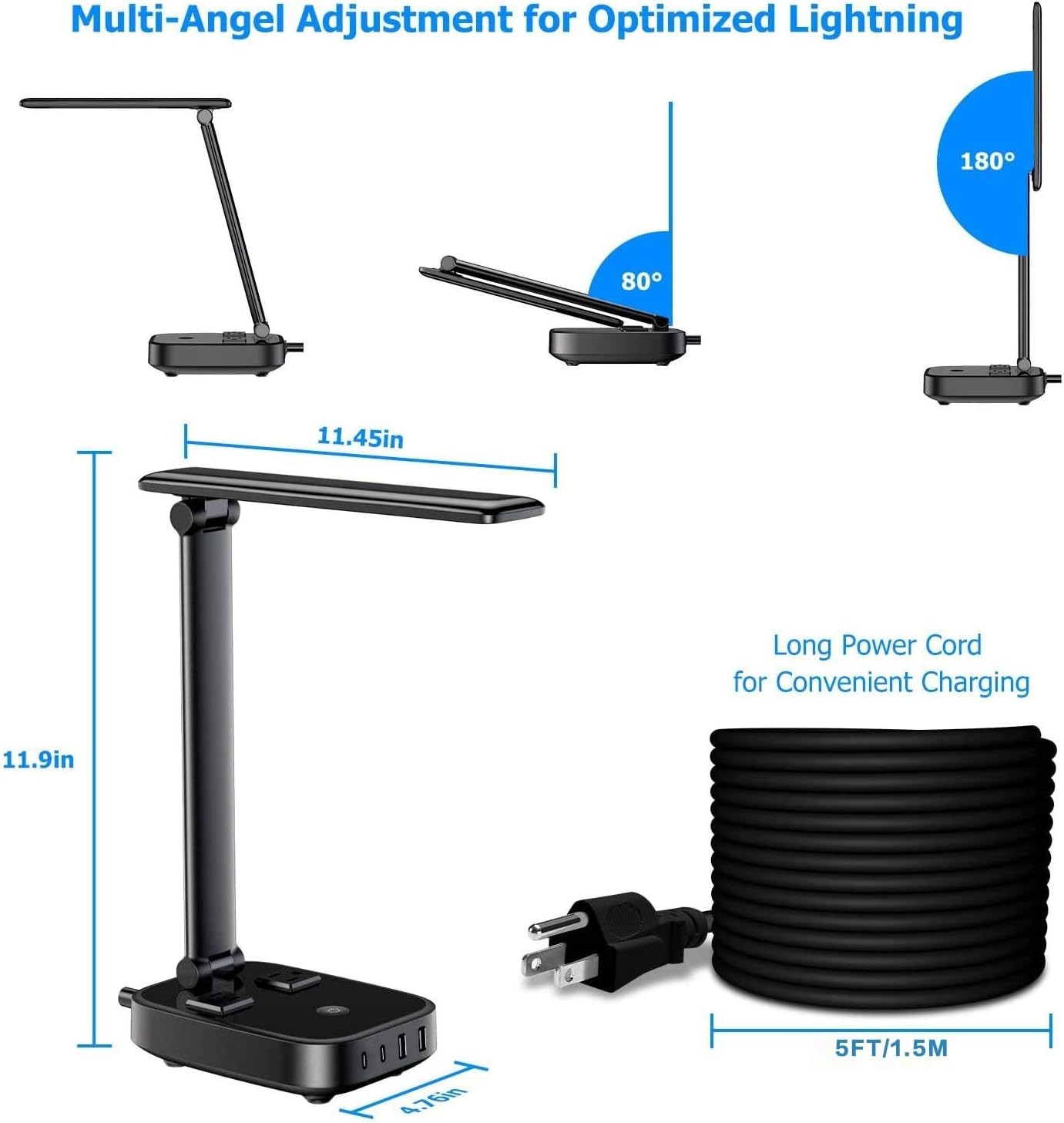 Modern Black LED Desk Lamp with Touch Control, 4 USB Ports 5ft Power Extension