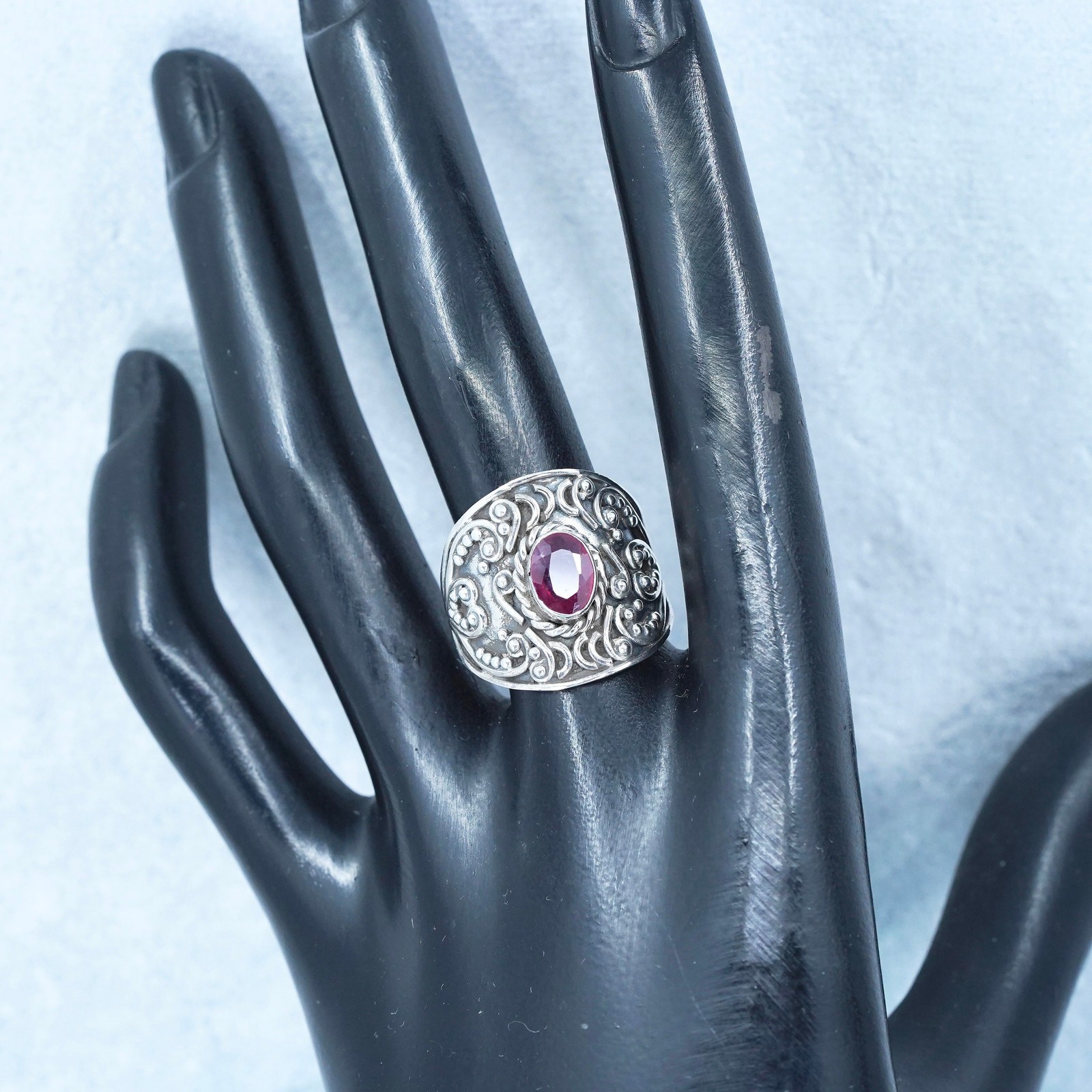 Size 8.25, vintage Sterling 925 silver handmade bali ring with ruby