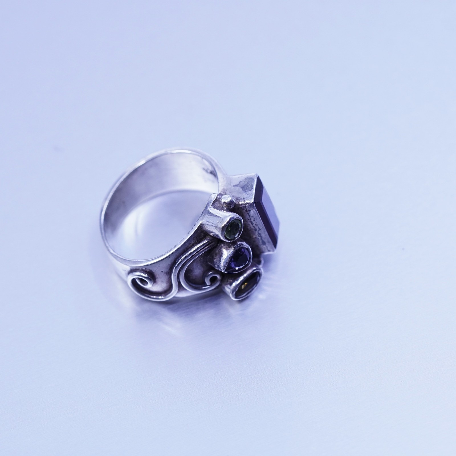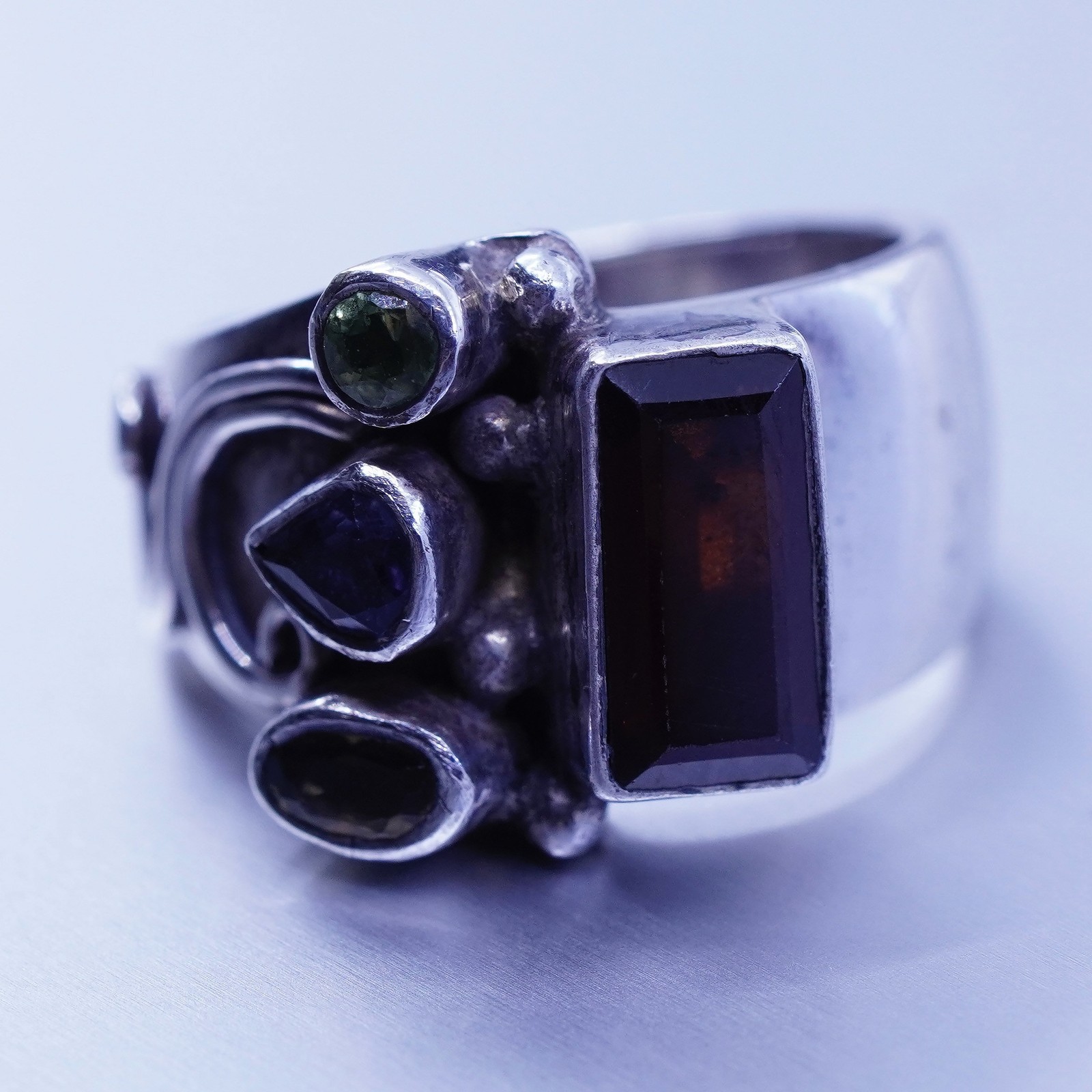 Size 5.75, vintage Sterling 925 silver handmade wide ring citrine ruby peridot
