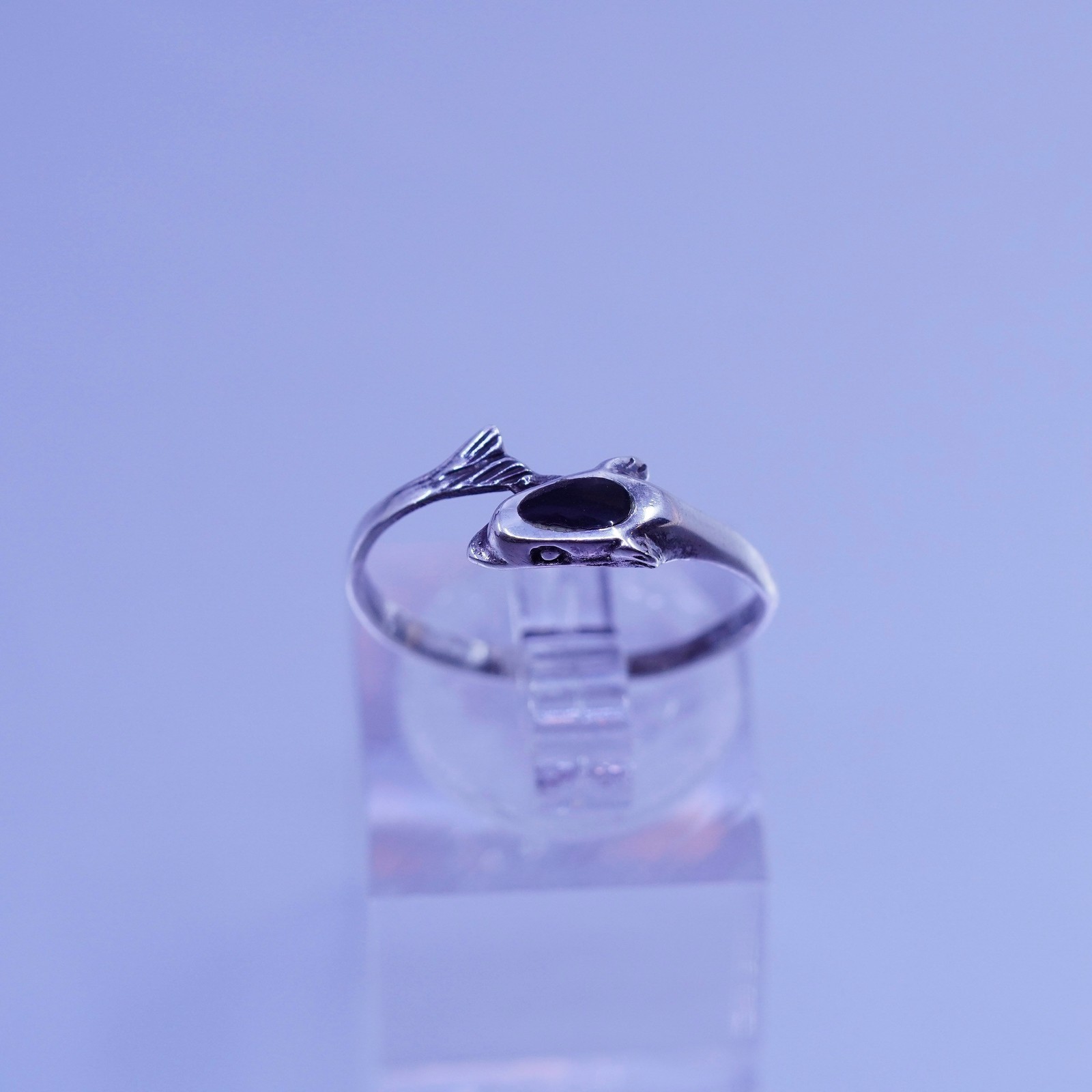 как выглядит Size 8, vintage modern Sterling 925 silver handmade dolphin ring with obsidian фото