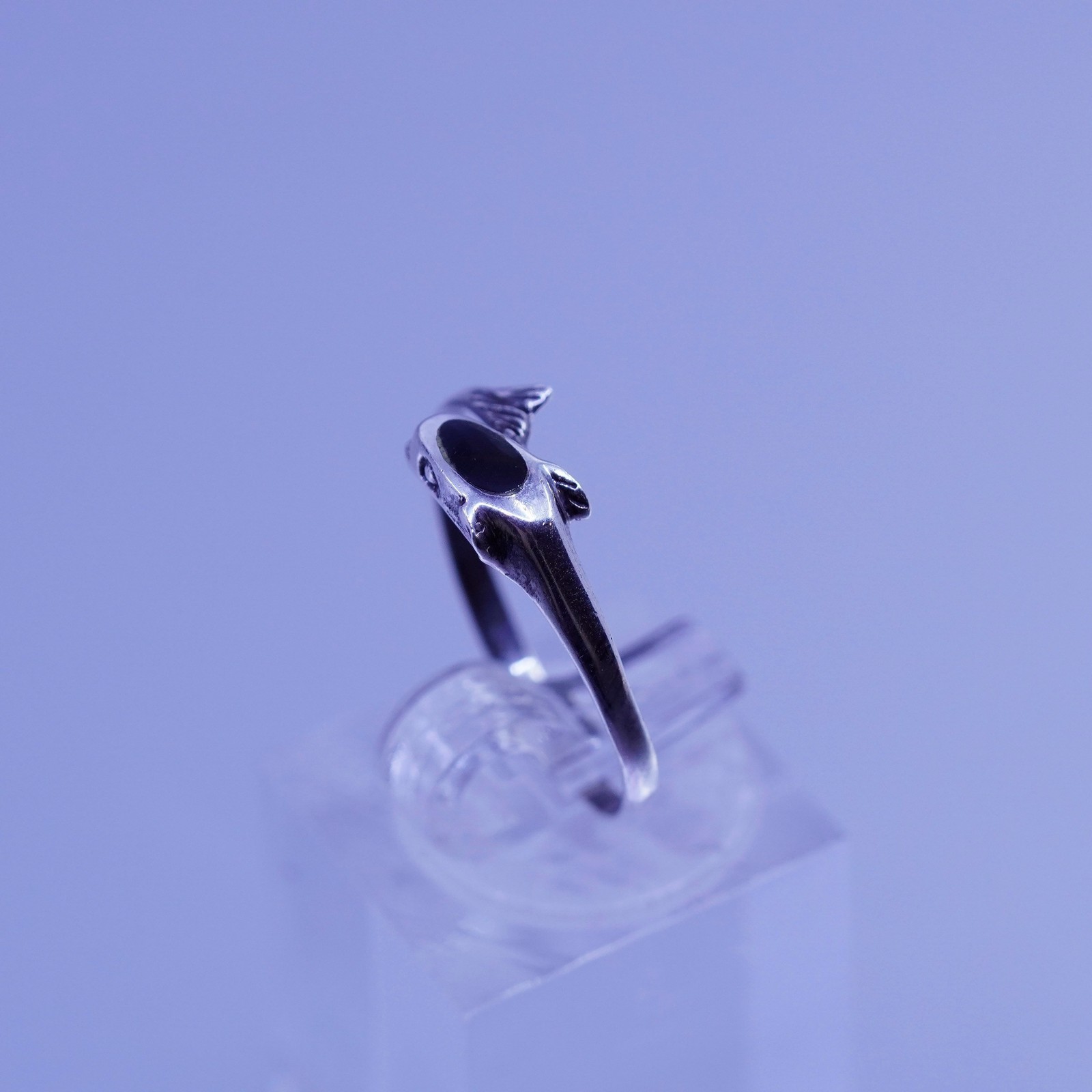Size 8, vintage modern Sterling 925 silver handmade dolphin ring with obsidian