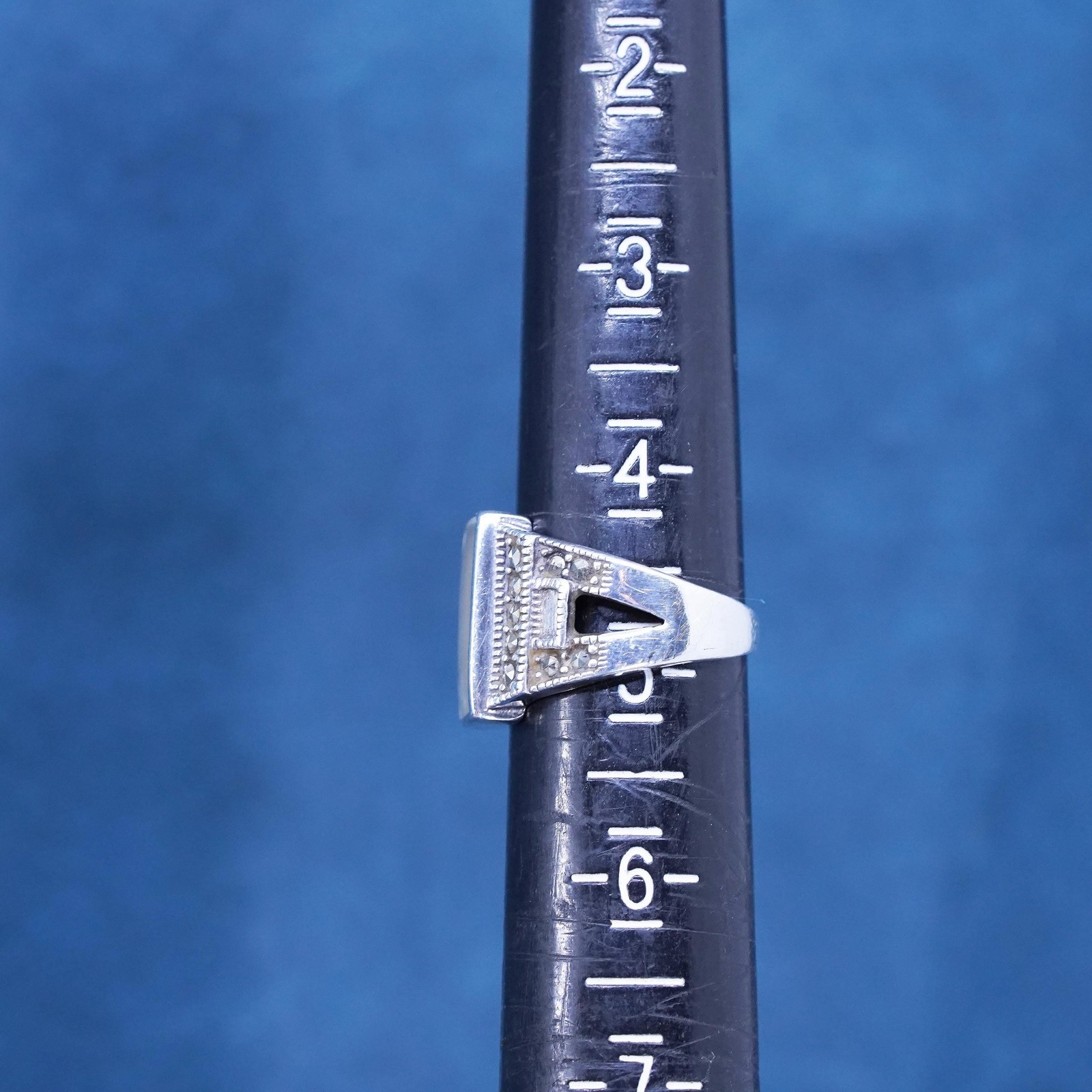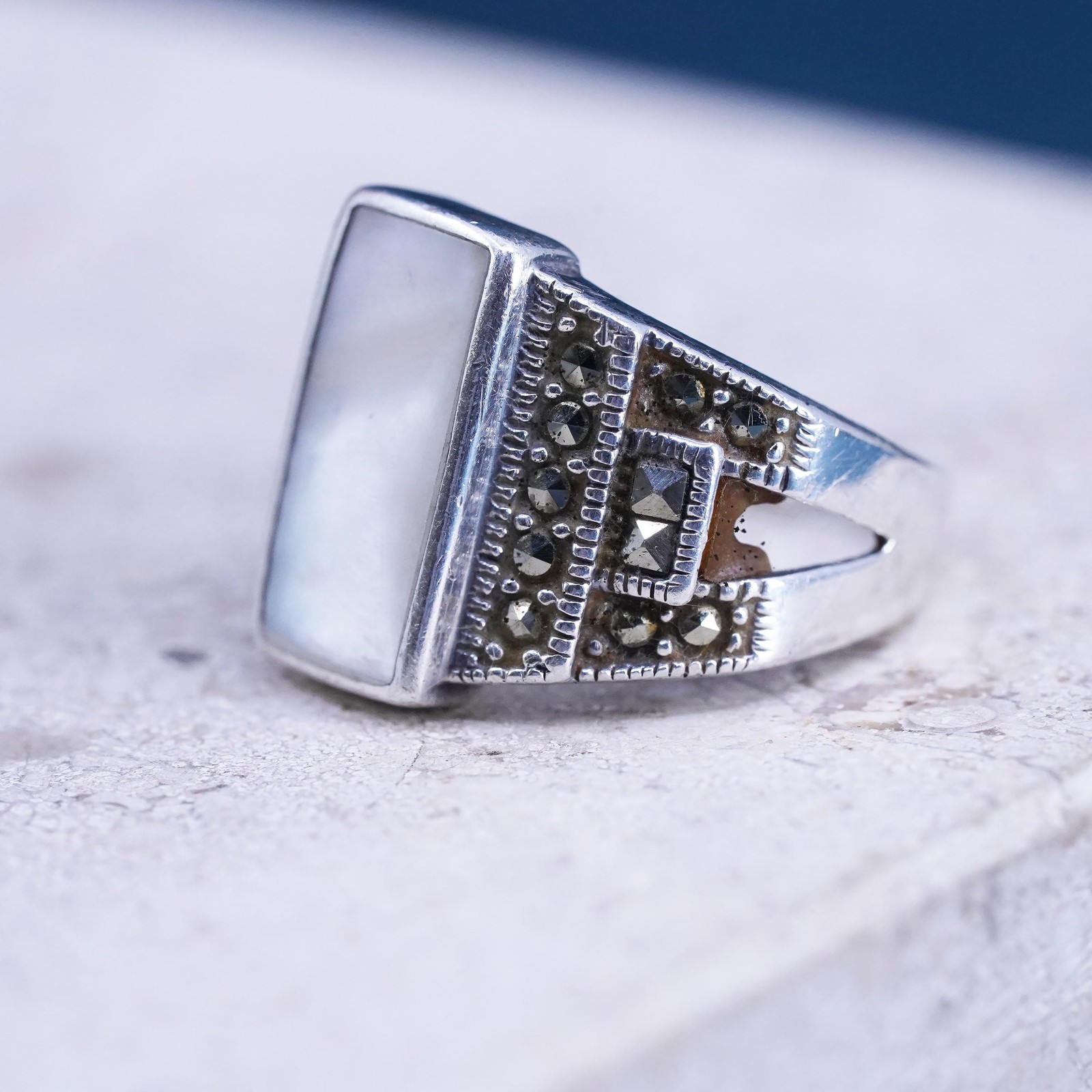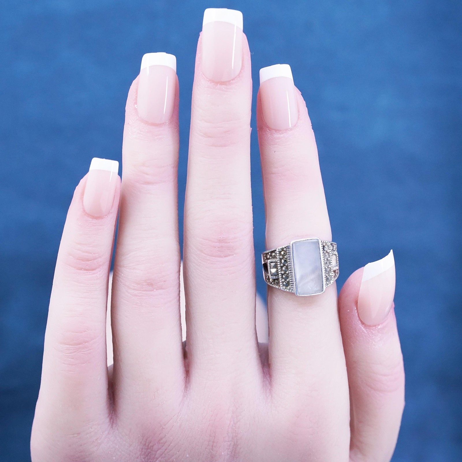 Size 4.5, vintage sterling 925 silver handmade ring mother of pearl marcasite