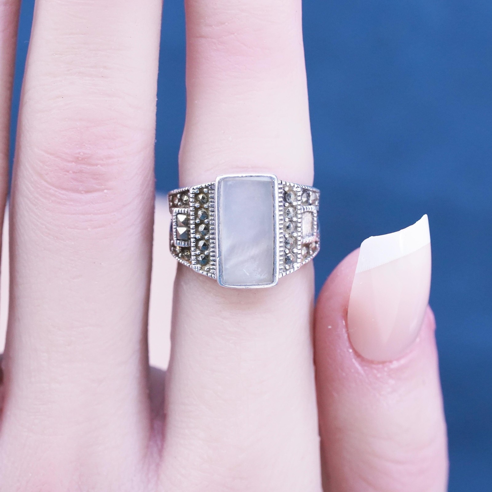 как выглядит Size 4.5, vintage sterling 925 silver handmade ring mother of pearl marcasite фото