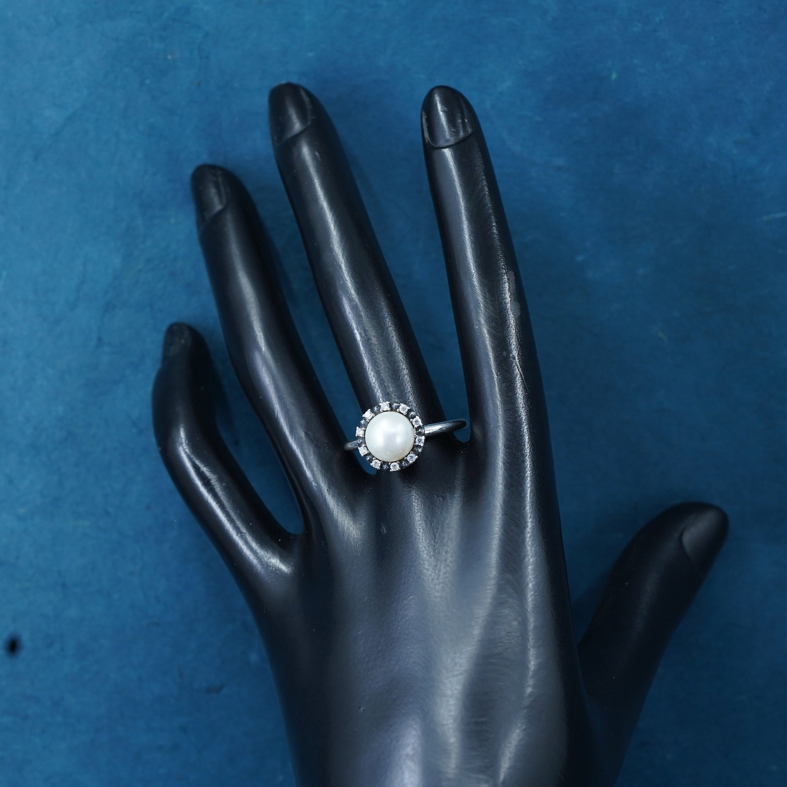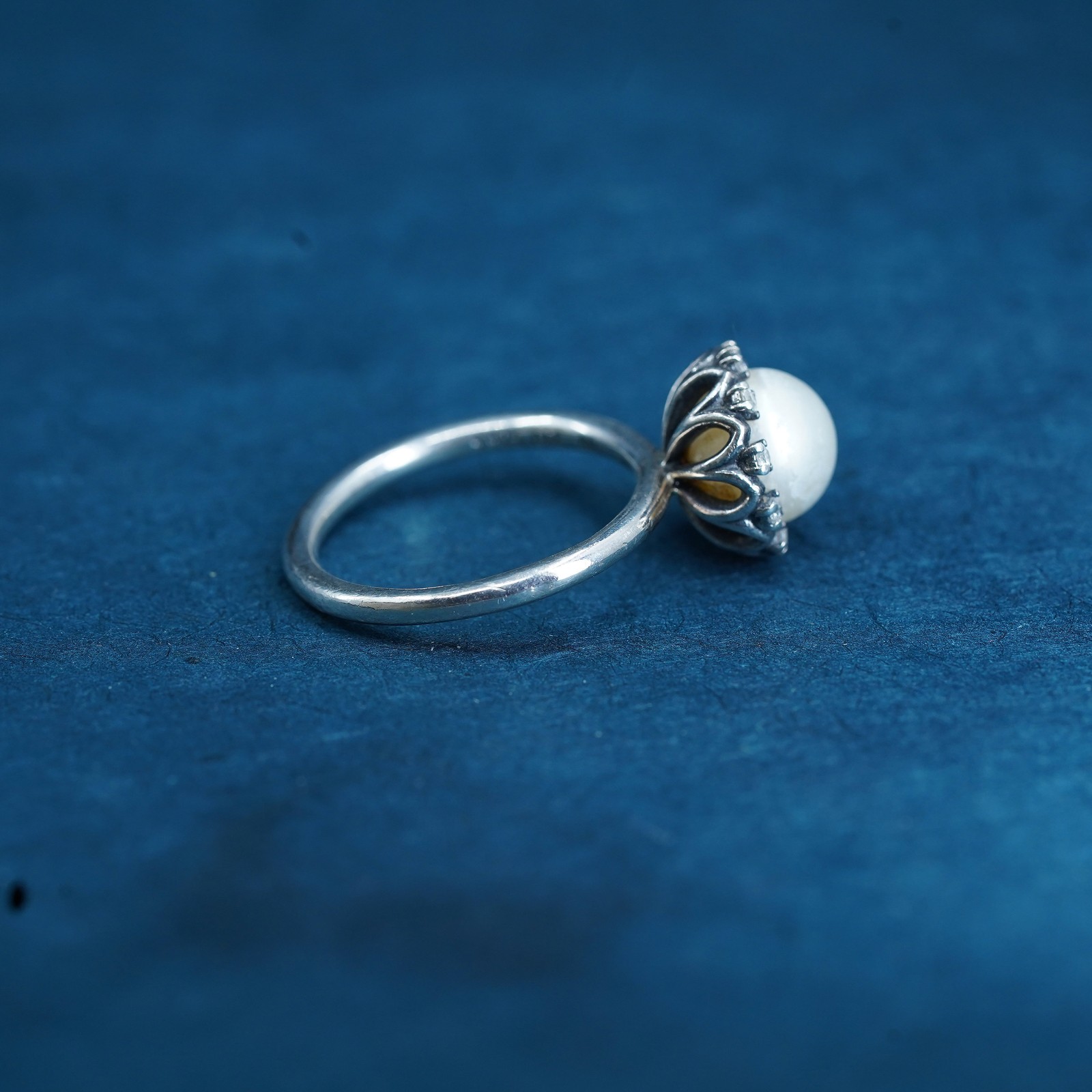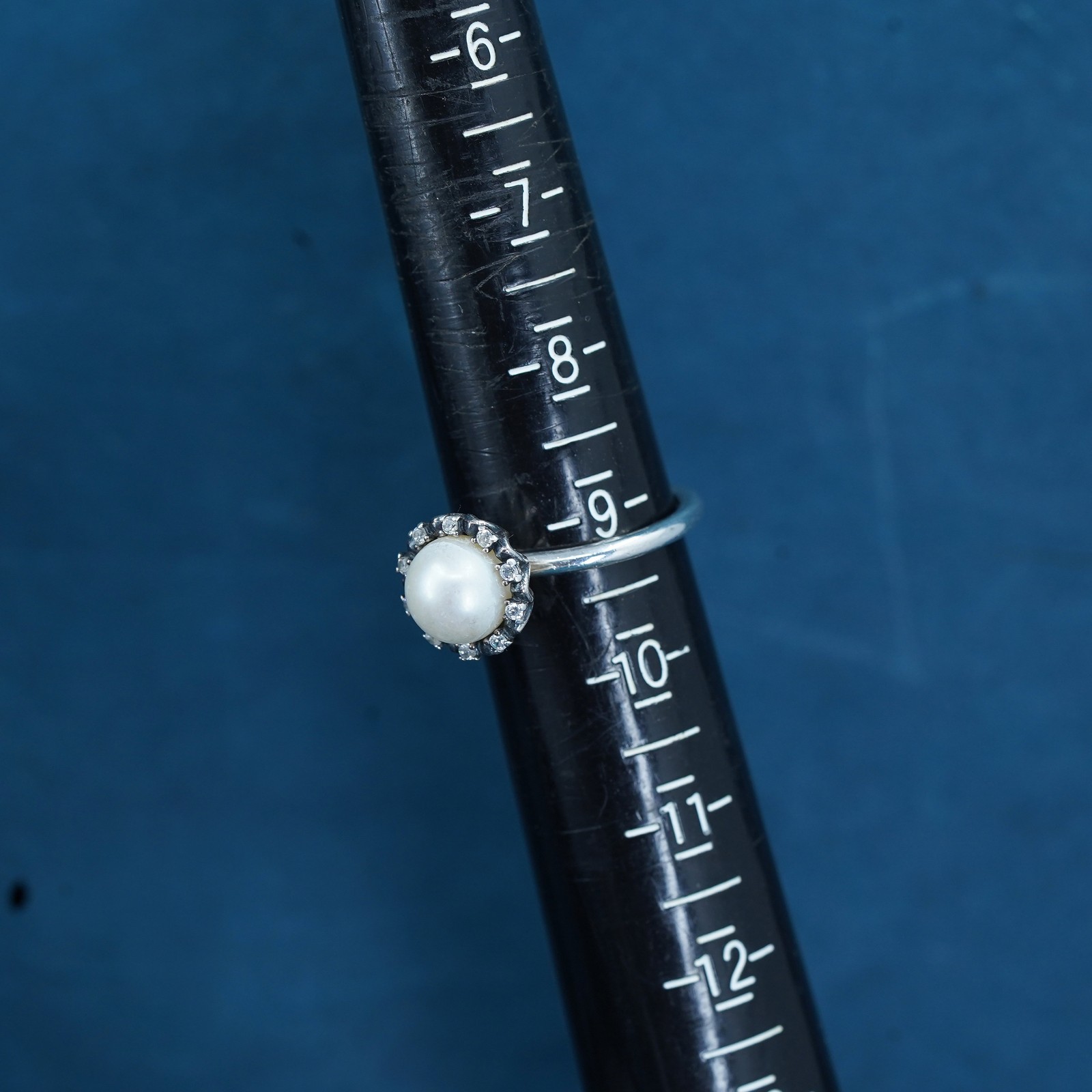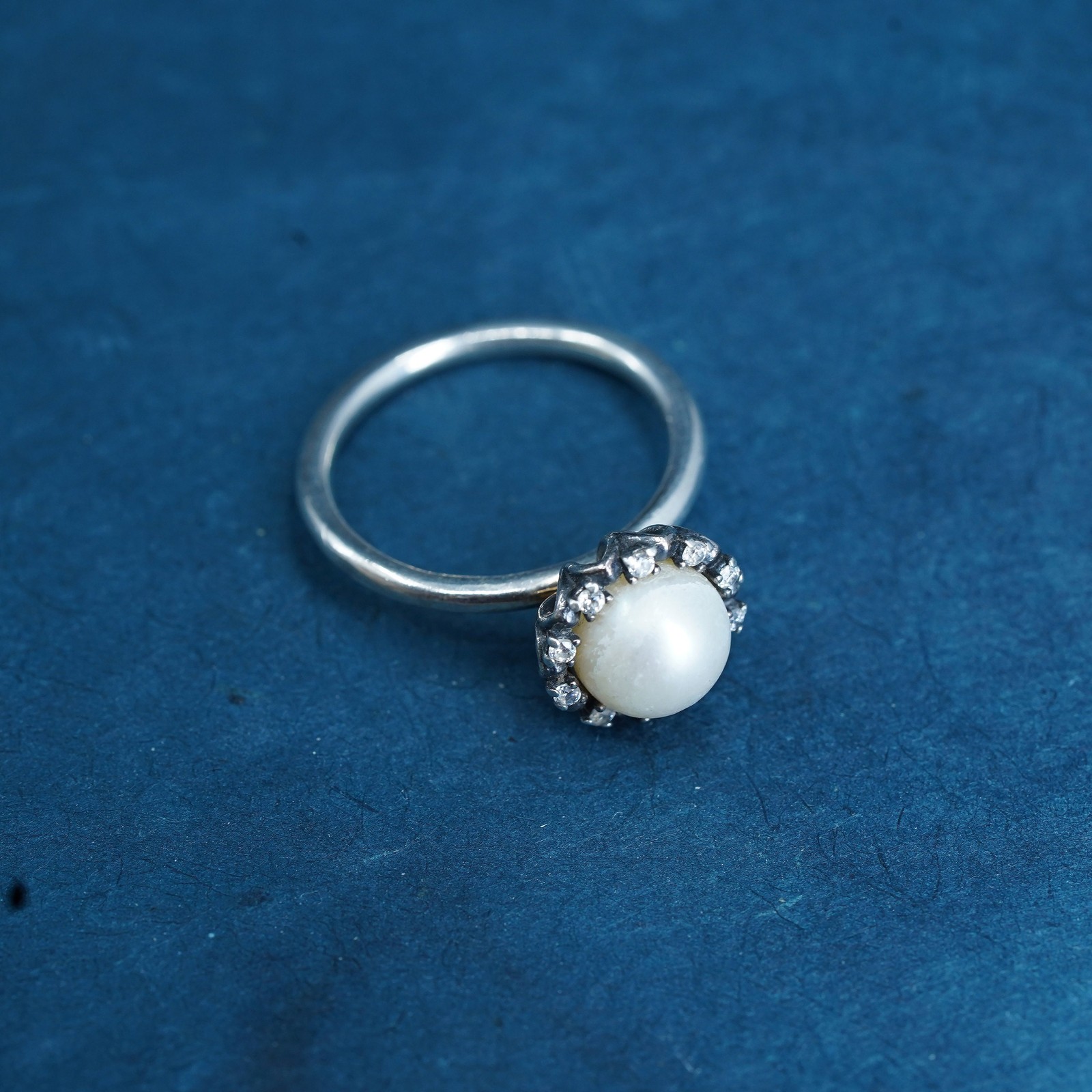 как выглядит Size 9, vintage ALE sterling silver ring, 925 stackable band pearl and crystal фото