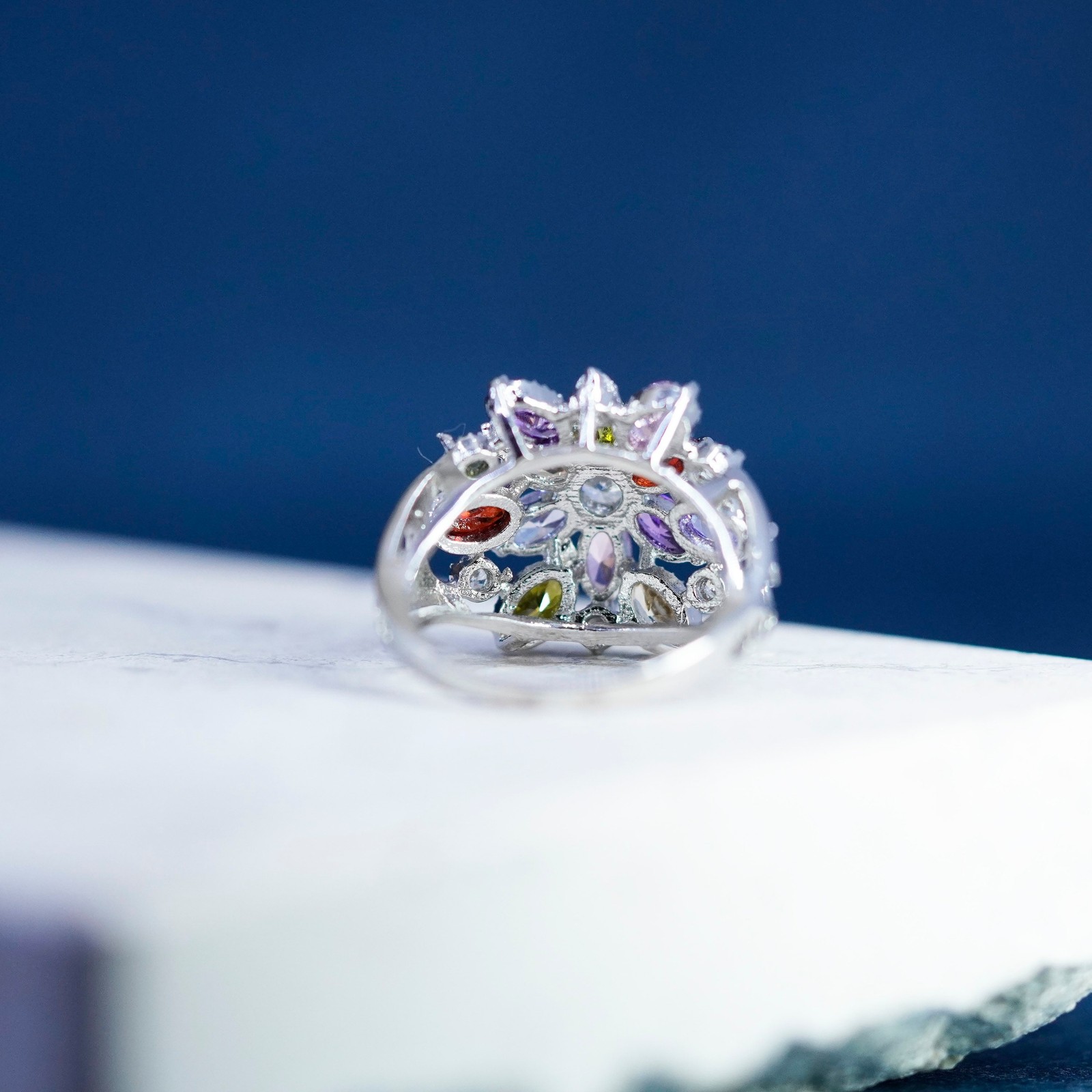 как выглядит Size 6.5, vtg Sterling 925 silver snowflake flower ring w/ cluster Colorful Cz фото