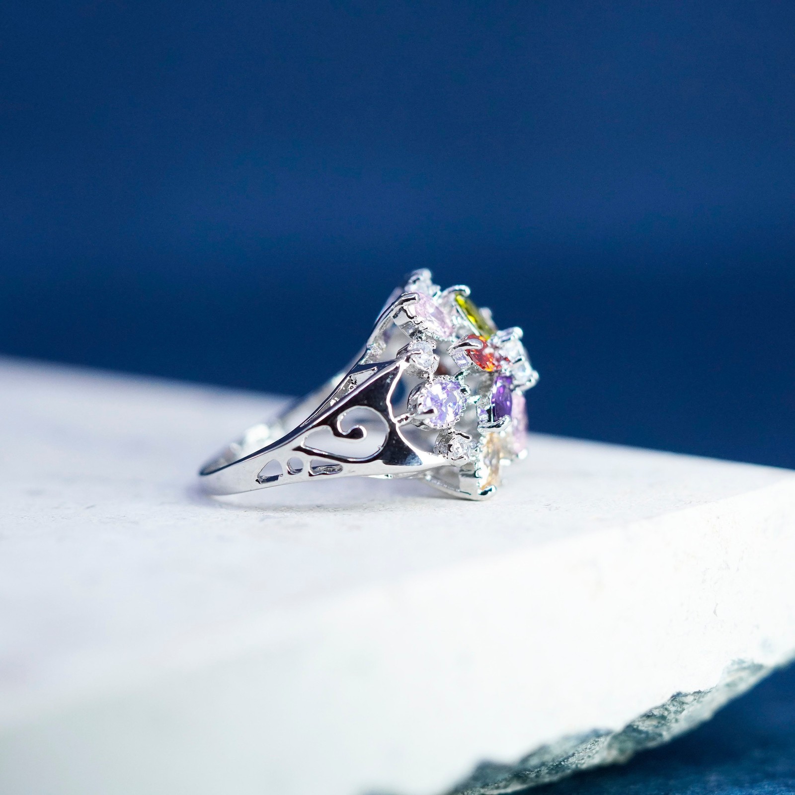 Size 6.5, vtg Sterling 925 silver snowflake flower ring w/ cluster Colorful Cz