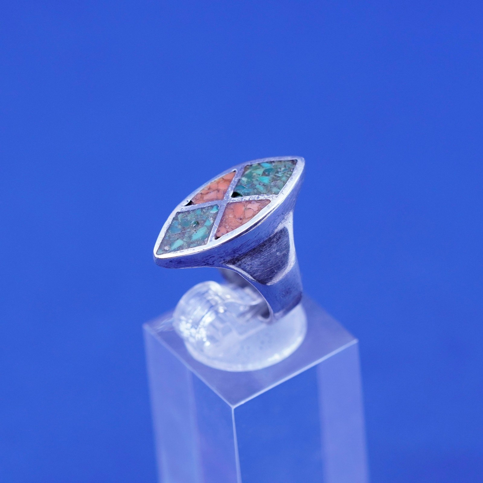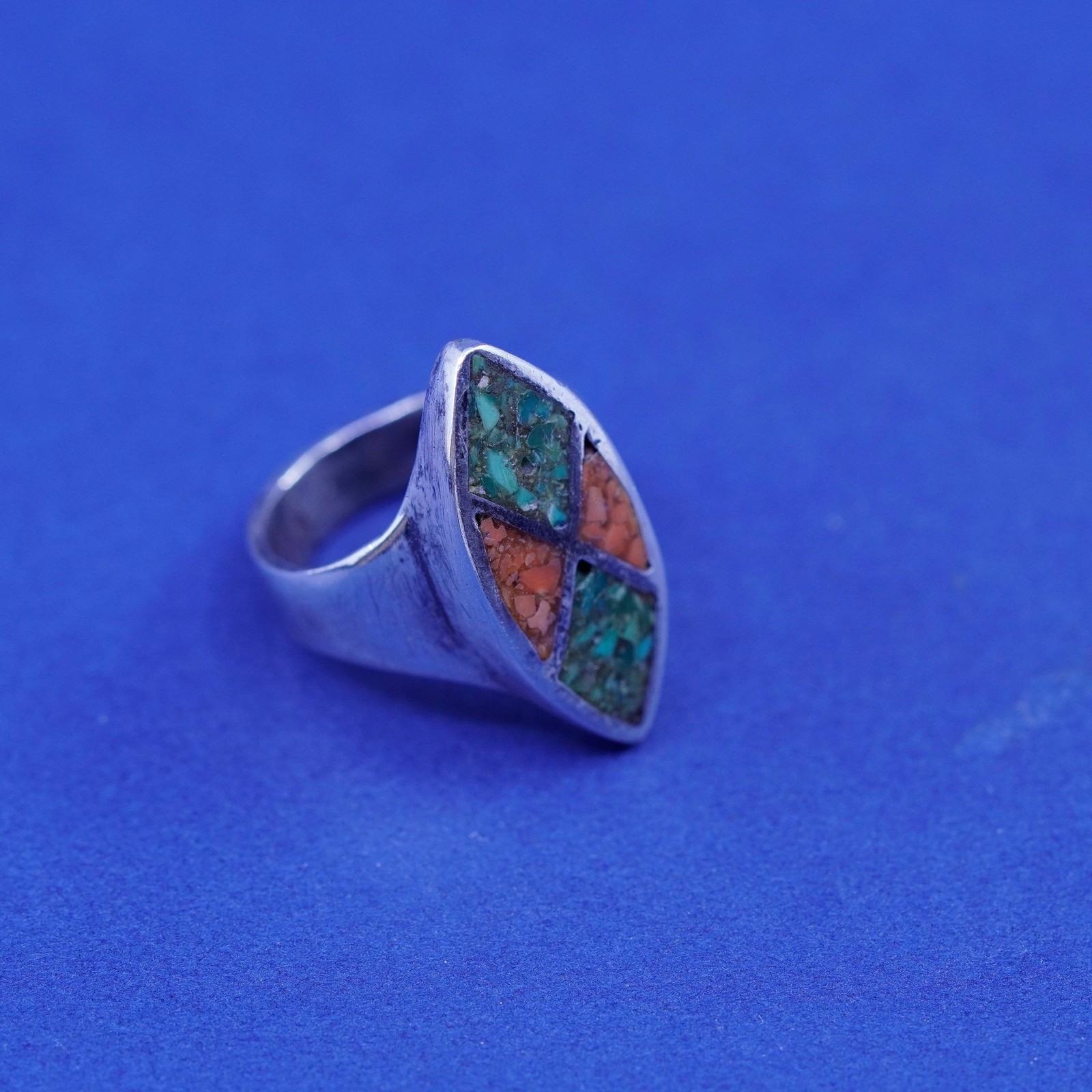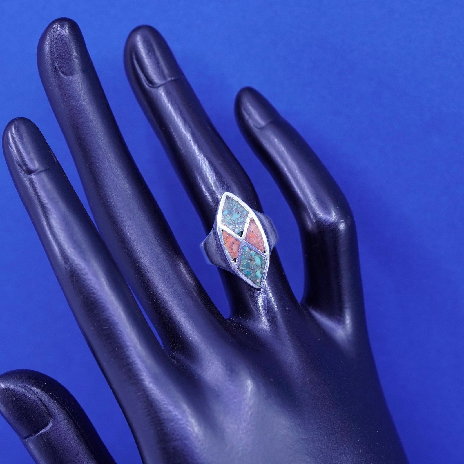 Size 4, Native American sterling silver handmade ring, 925 band turquoise coral
