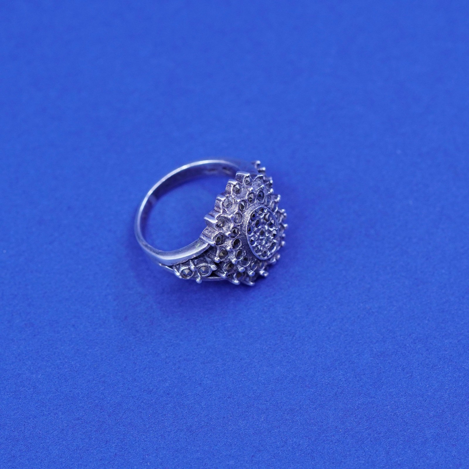 Size 6, vintage Sterling silver handmade ring, 925 floral band with marcasite