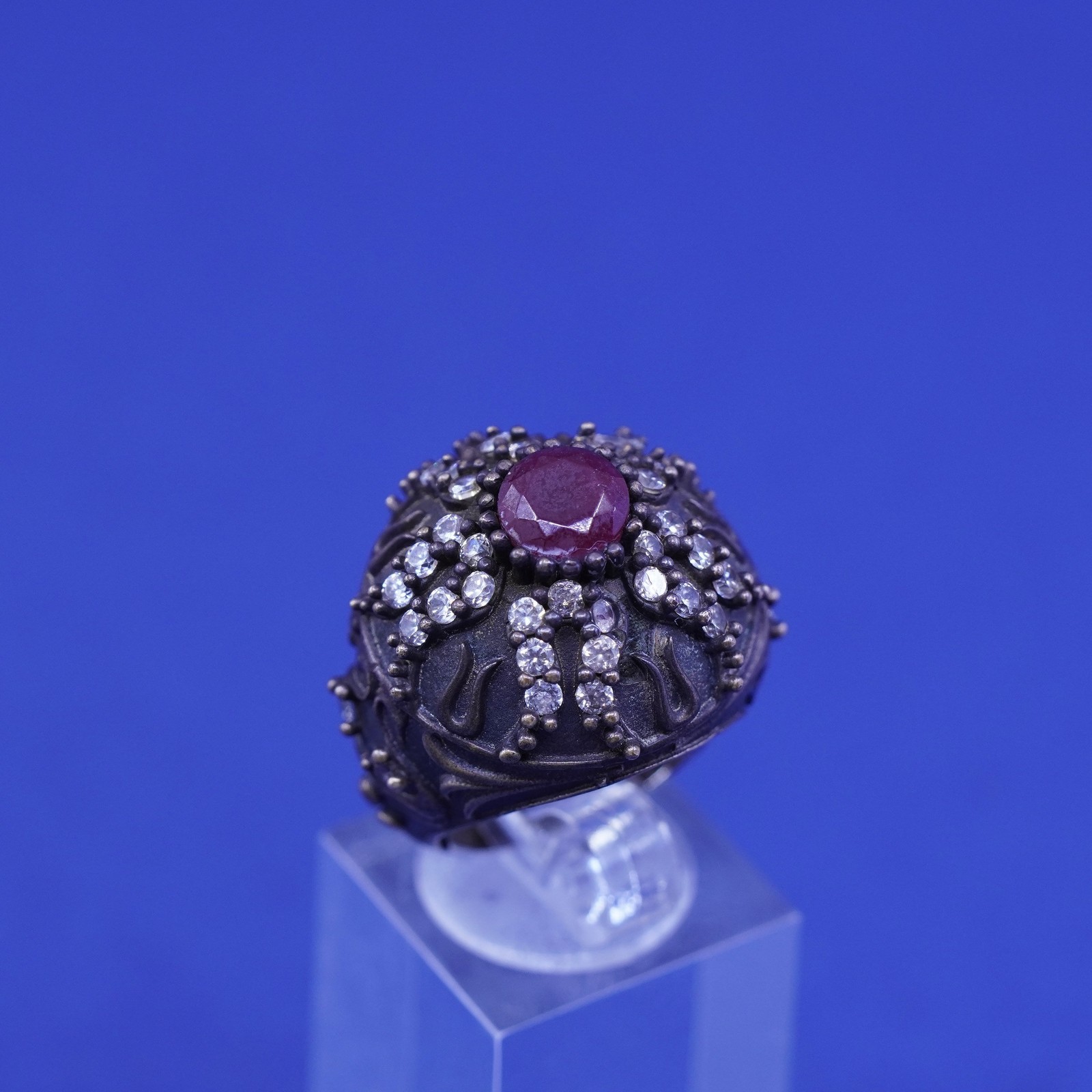 Size 6.25, vintage Sterling 925 silver handmade crown Statement ring ruby Cz
